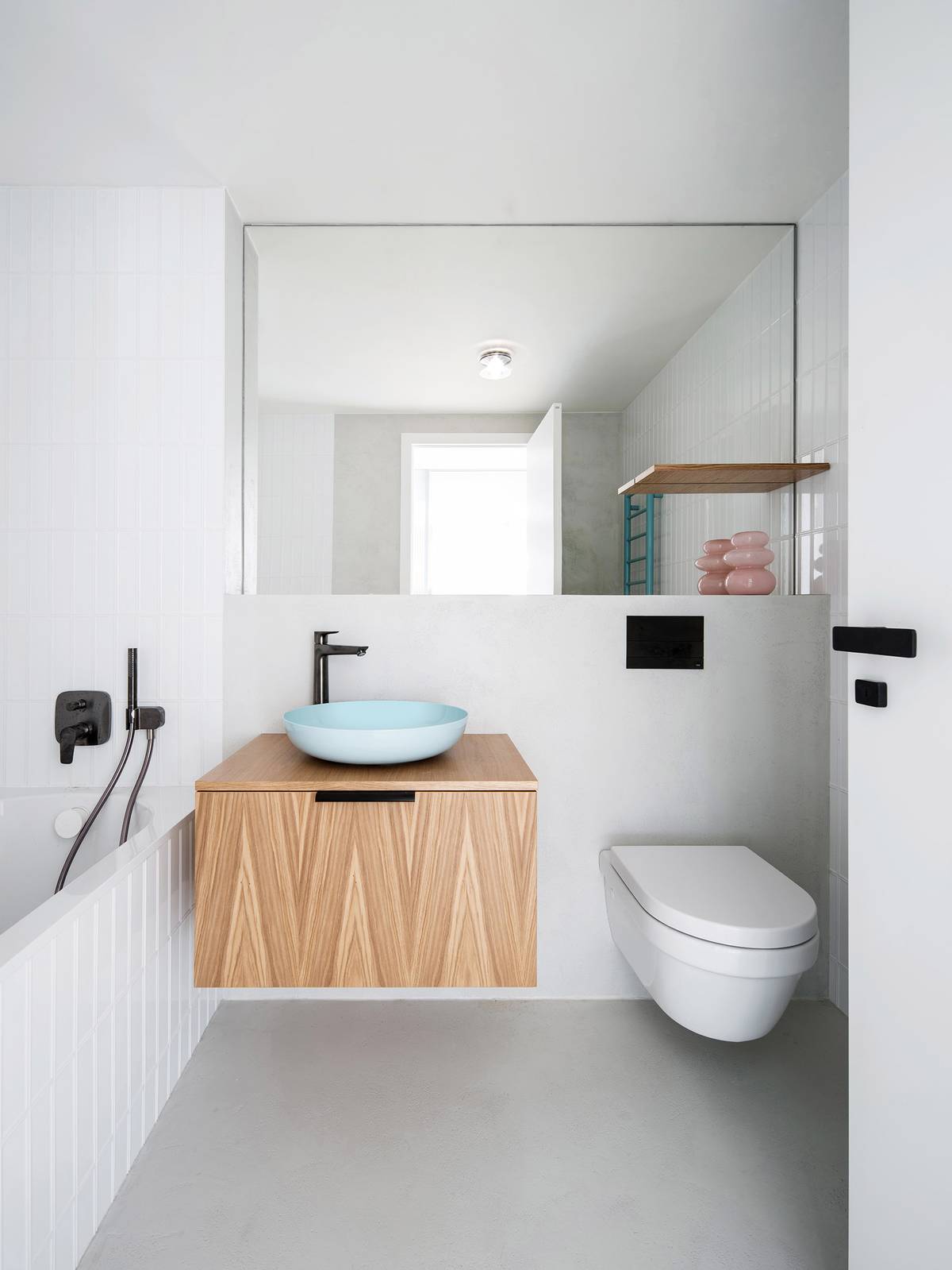 Barevně neutrální základ podlahy, stěrky a bílých obkladů malého formátu je doplněn zelenkavým umyvadlem na desce a radiátorem stejné barvy.