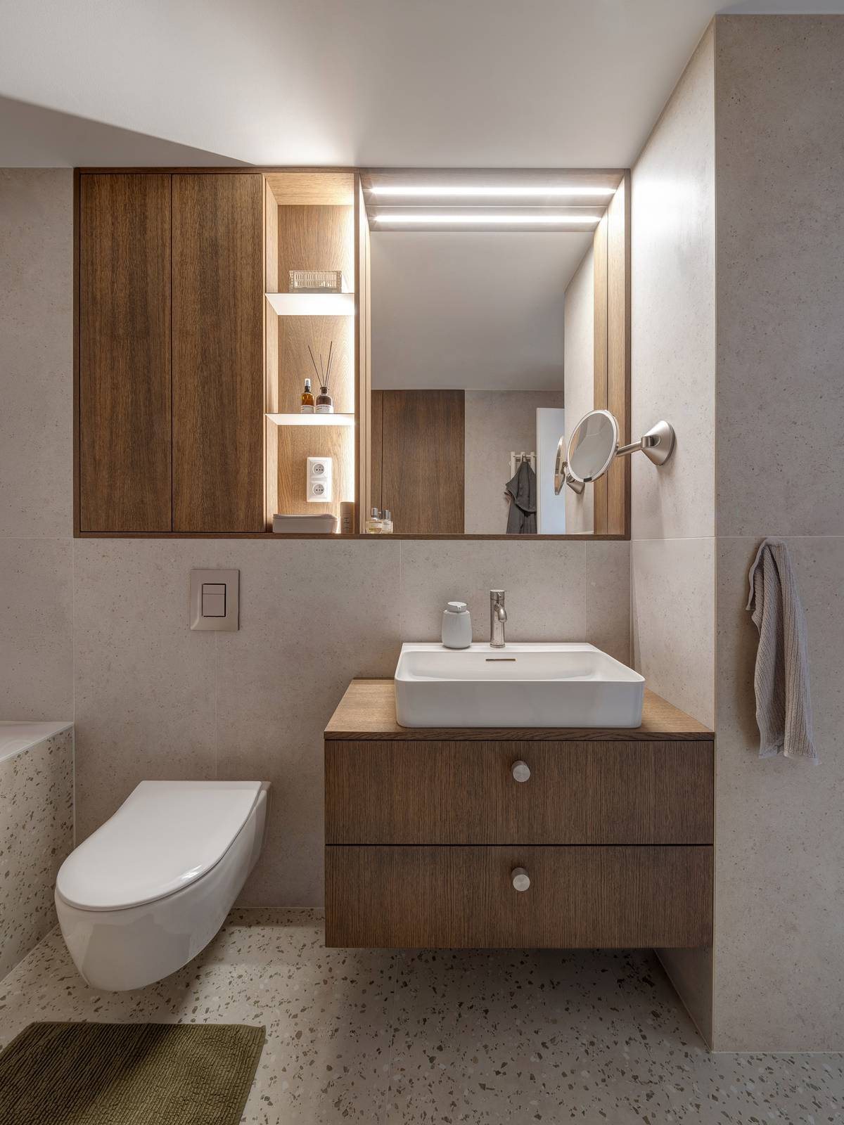 Základem je podlaha a stěny opatřené stěrkou, která je doplněna drobnějším, barevně výraznějším keramickým obkladem. Dřevěná skříňka je na míru vyrobena truhlářem. Dřevo je v koupelně potřeba důkladně ošetřit tak, aby bylo možné jej použít do vlhkých prostor.