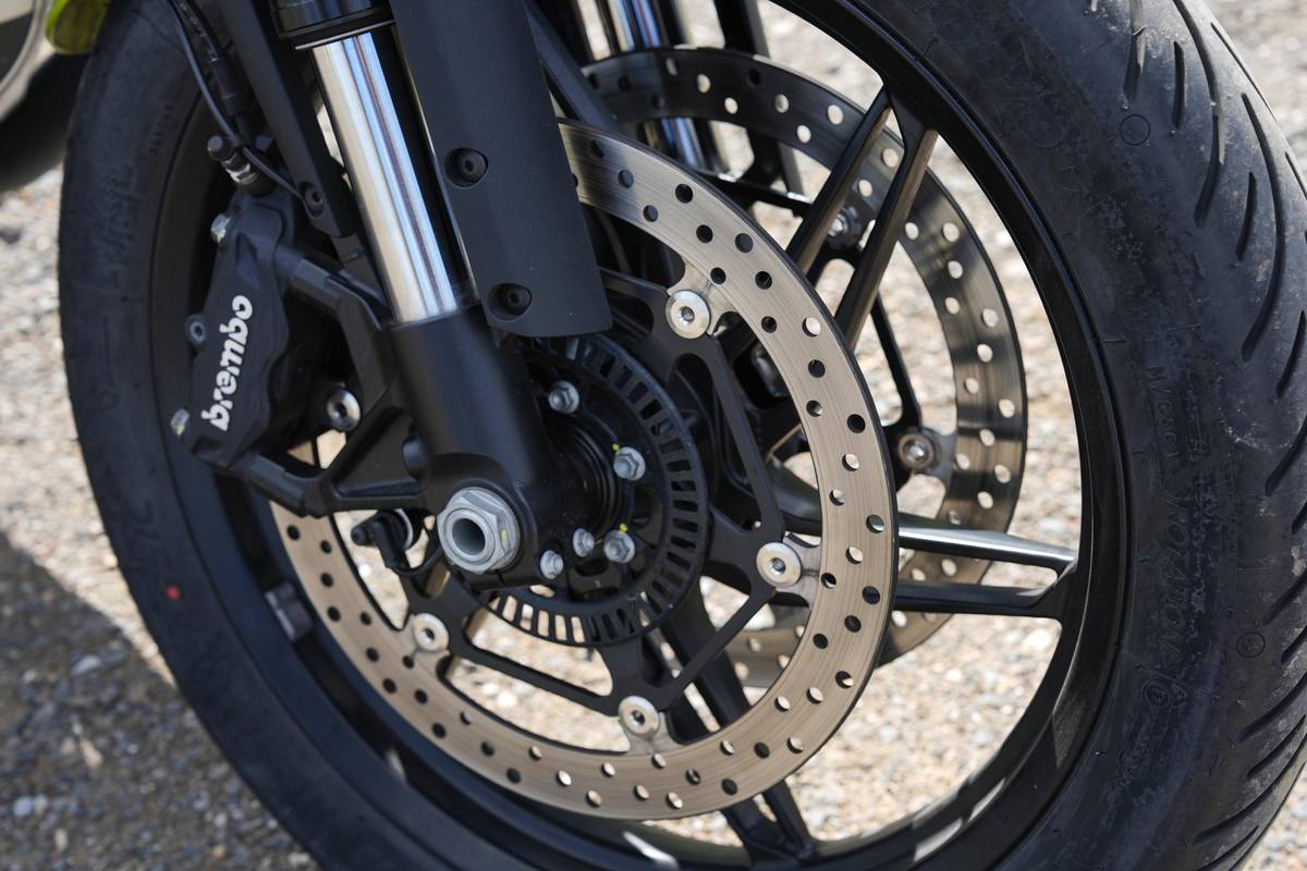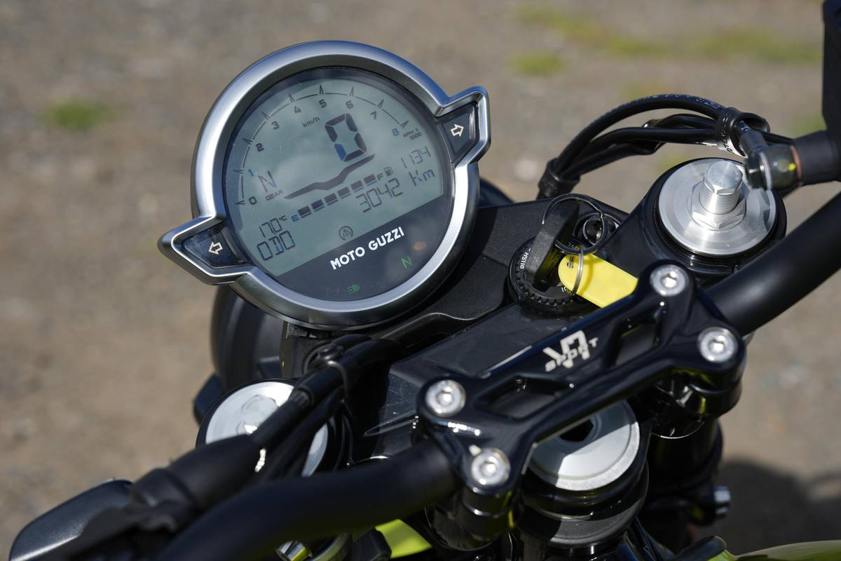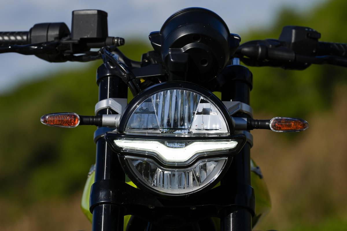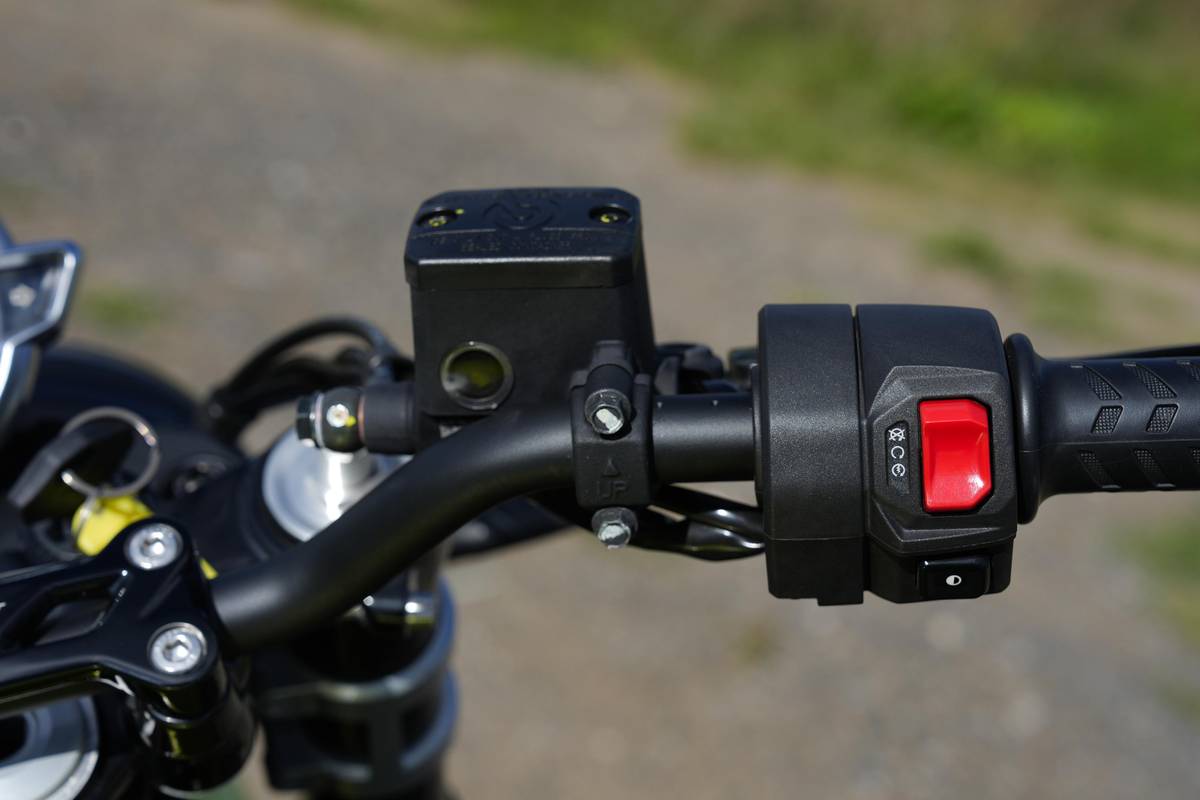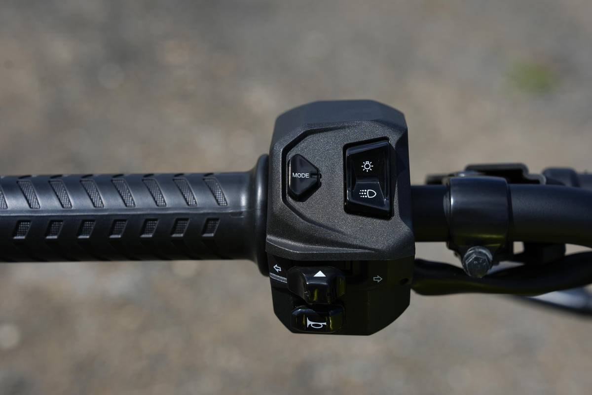 Ovládací prvky na pravé straně řídítek. Pod tlačítkem startéru se nachází volič jízdních režimů.