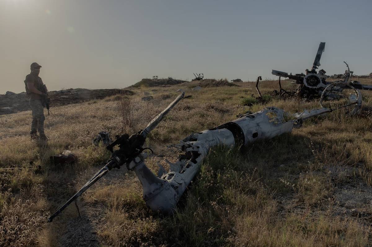 Snímky agentura AFP zveřejnila až v září. (Člen ukrajinské vojenské rozvědky kráčí k vyhořelému vojenskému vozidlu na Hadím ostrově, 14. srpna.)