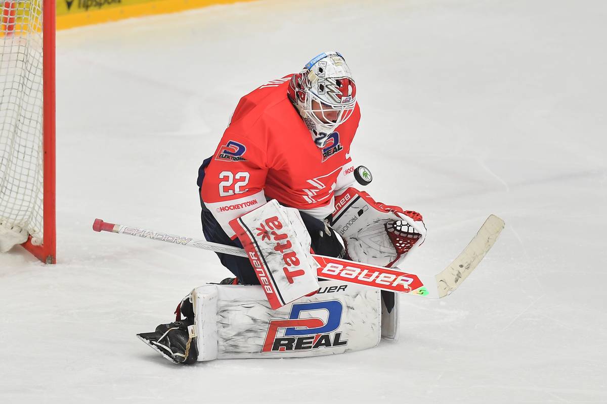Brankář Pardubic Roman Will se svou helmou.
