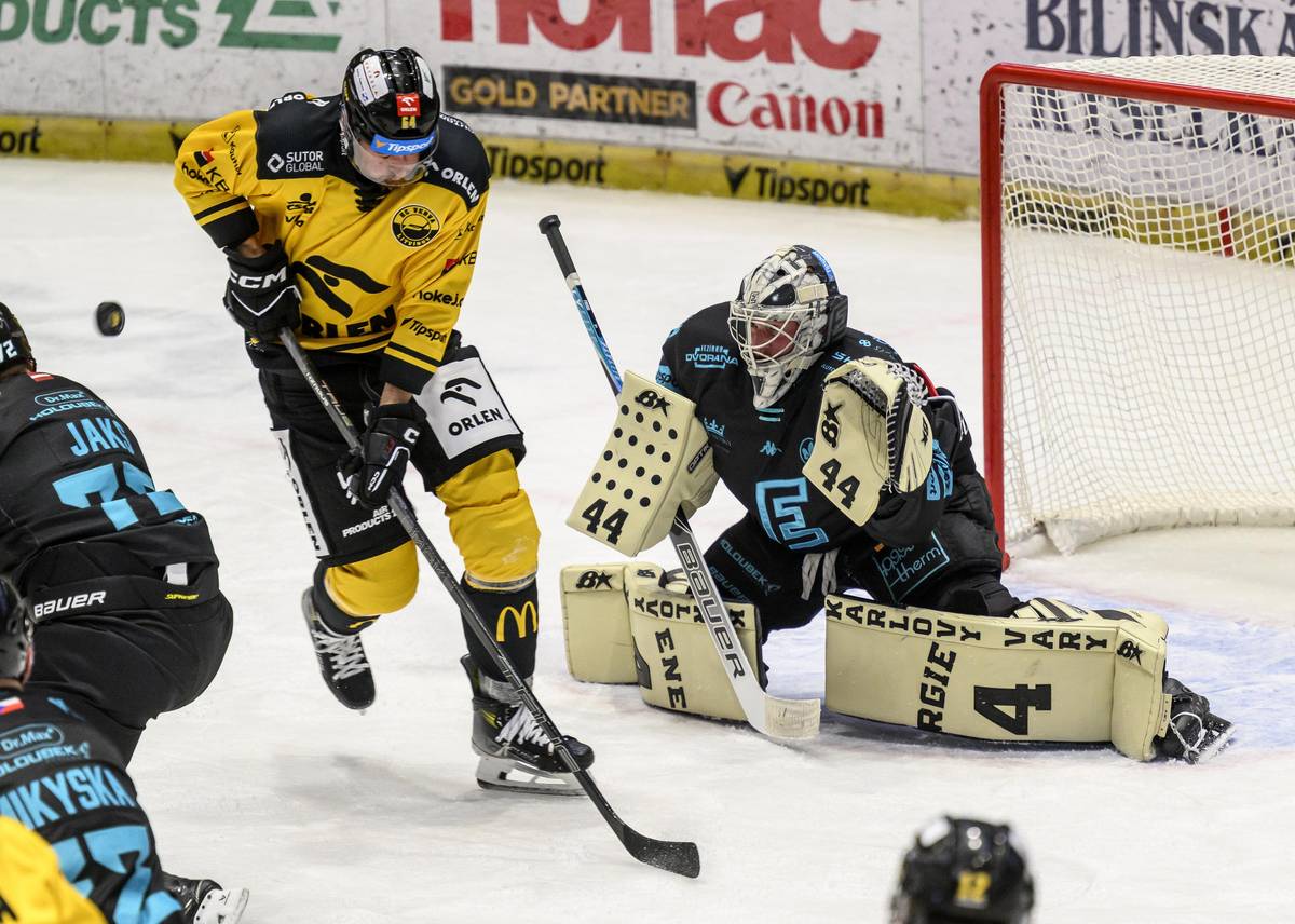 Brankář Karlových Varů Dominik Frodl se svou helmou.