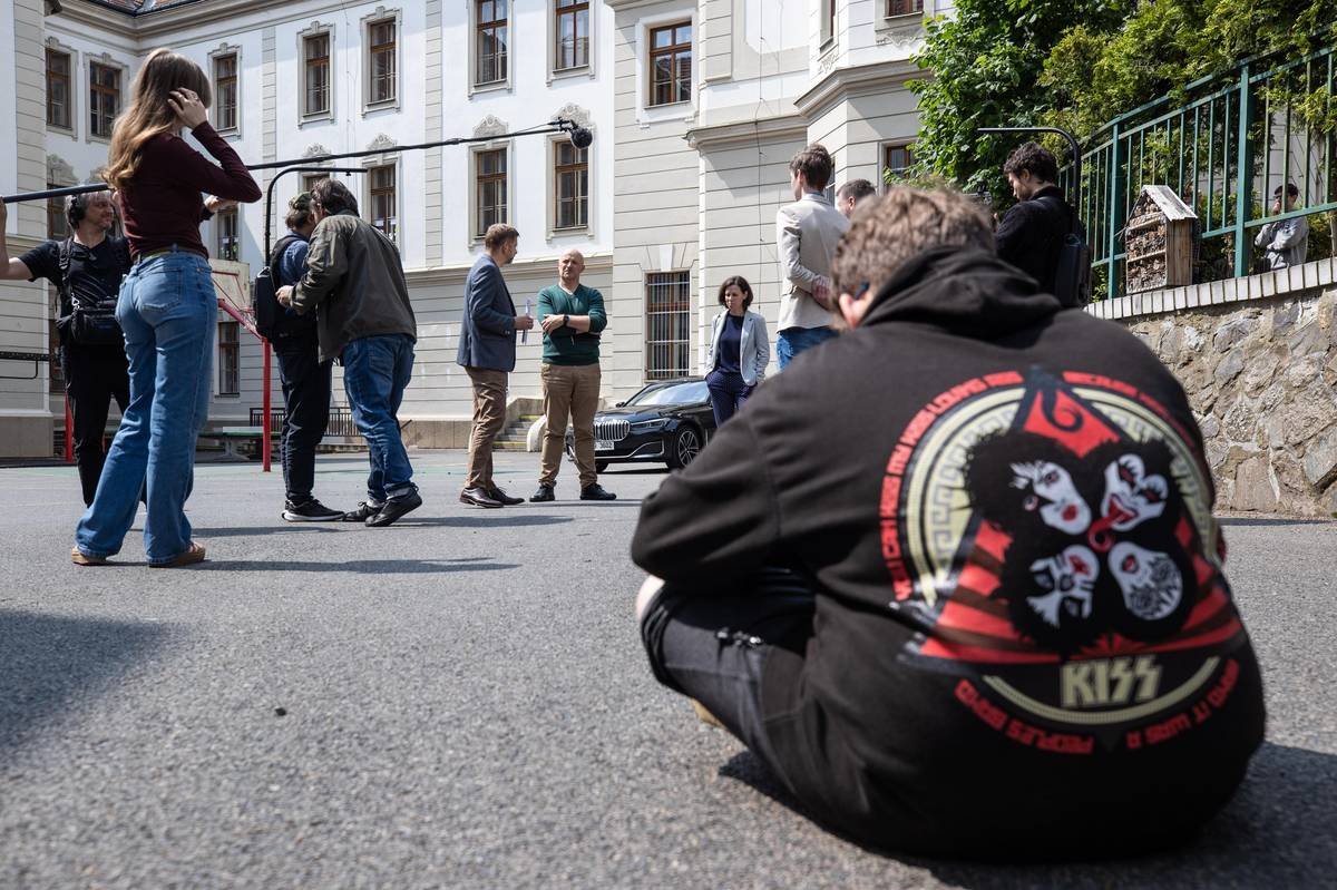 Natáčení na školním dvoře se chýlí ke konci, ale na ministra čeká ještě několik žáků, kteří si s ním chtějí udělat společnou fotku.
