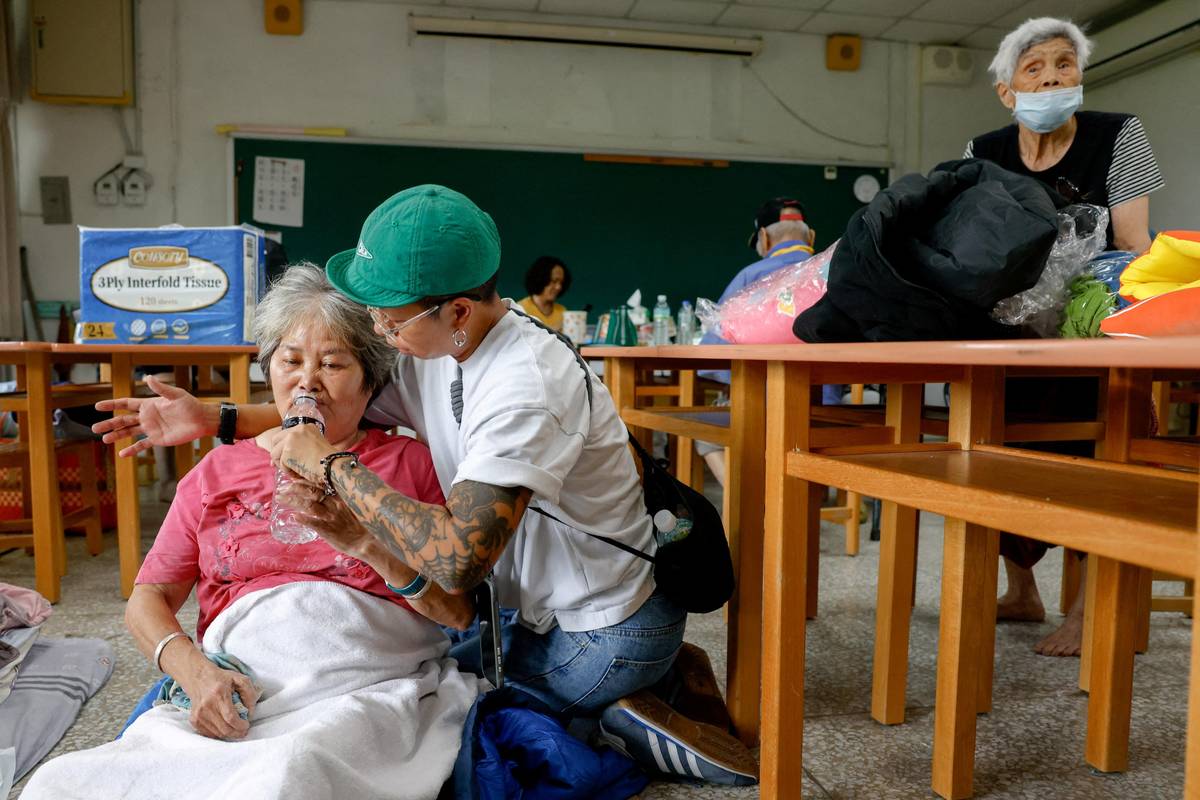 Mnoho obyvatel zaplaveného Kuang-fu v turisty hojně navštěvované oblasti Chua-lien si stěžovalo na nedostatečné varování před vylitím jezera. (Dobrovolníci pomáhají evakuovaným v úkrytu zřízeném v základní škole v Chua-lienu, 24. září.)