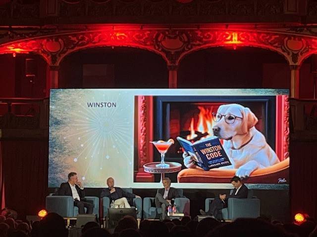 Autor na besedě leccos prozradil… Miláček Dana Browna? Labrador Winston. Spisovatel jej ukázal na diskusi v Lucerně hned dvakrát. Na snímku je Brown druhý zleva. Zcela vlevo je jeho český přítel, Petr Onufer z Arga, třetí zleva je Brownův americký redaktor Jason Kaufman (který je i postavou knihy), následuje moderátor Daniel Stach.