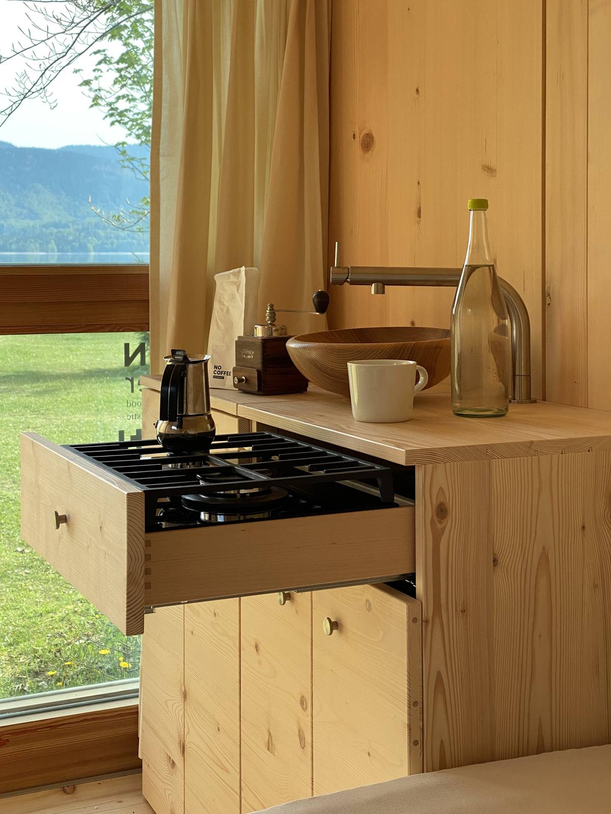 Kuchyňská zóna s umyvadlem a výsuvným sporákem.