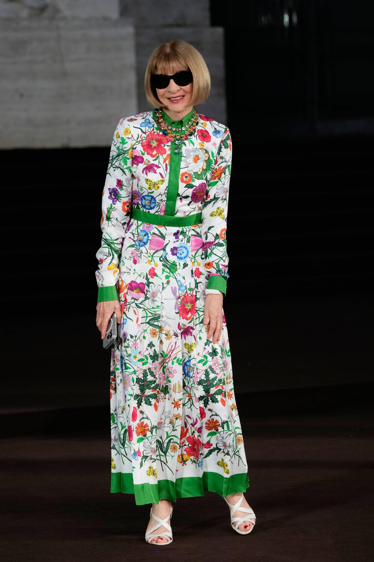 Velkou pozornost na sebe strhla i módní ikona Anna Wintourová v květovaných šatech Gucci a páskových sandálkách.