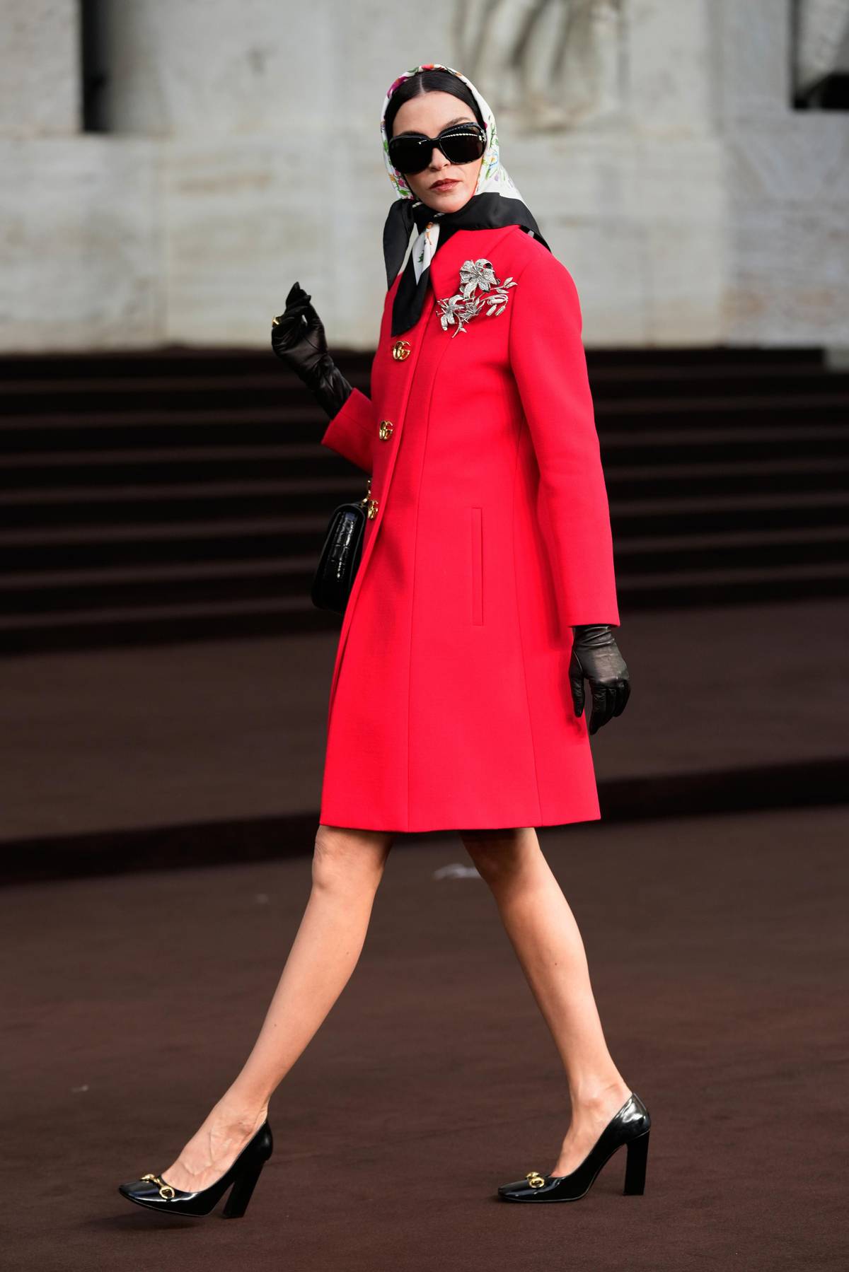 Italská modelka a herečka Mariacarla Bosconová vypadala v červeném kabátu a šátku s tmavými brýlemi dokonale.