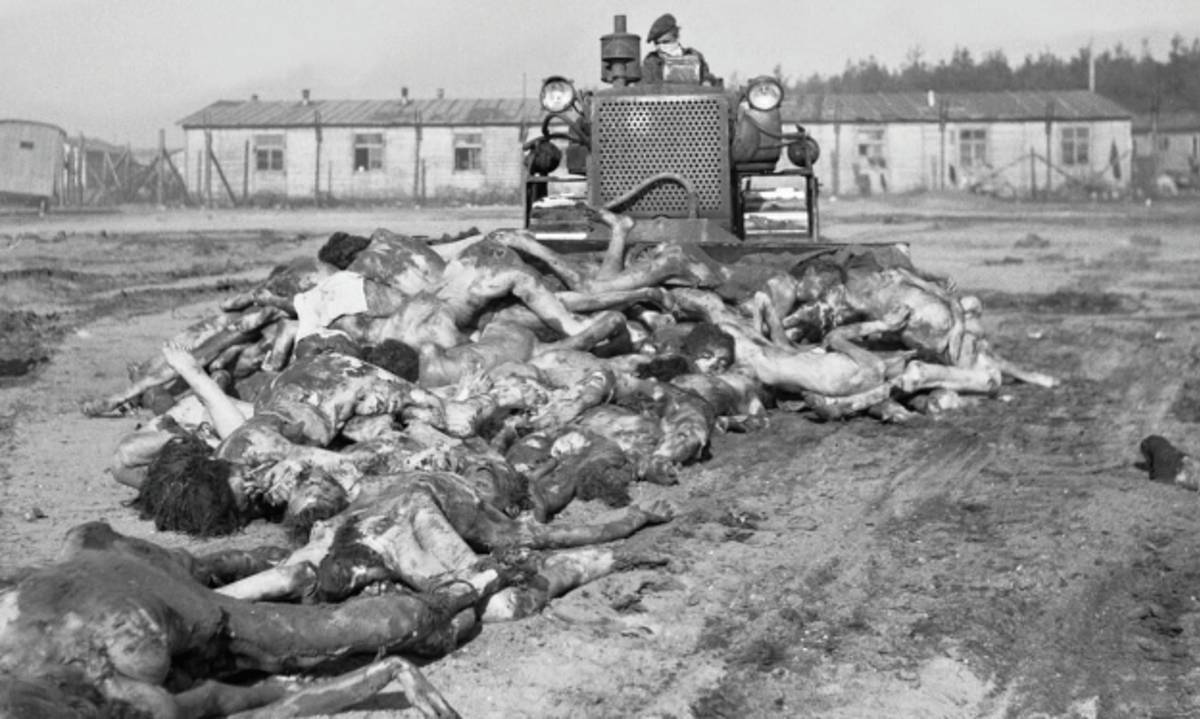 Britský armádní buldozer při práci: Hrnutí mrtvých těl do hromadného hrobu, bývalý KT Bergen-Belsen, 19. duben 1945