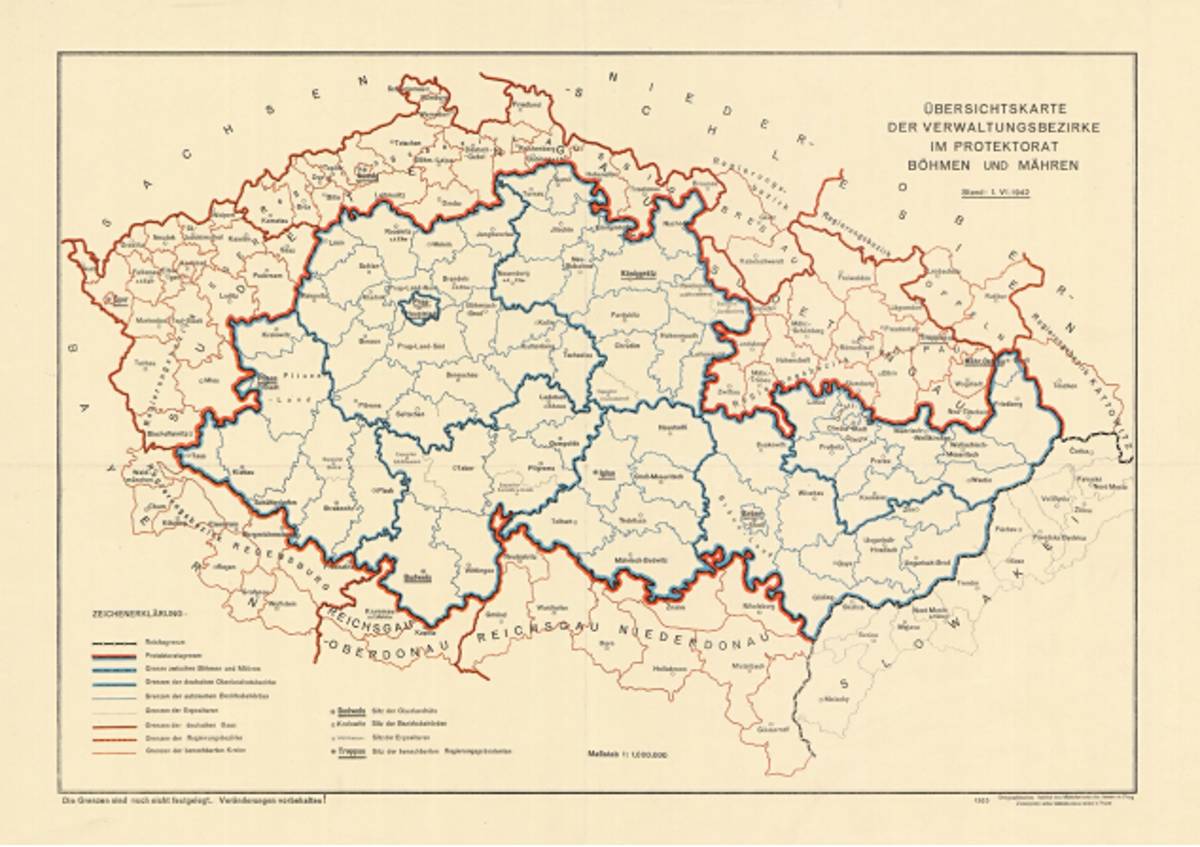 Přehledná mapa správních okresů Protektorátu Čechy a Morava s vyznačenými hranicemi oberlandrátů po Heydrichově správní reformě, 1. červen 1942