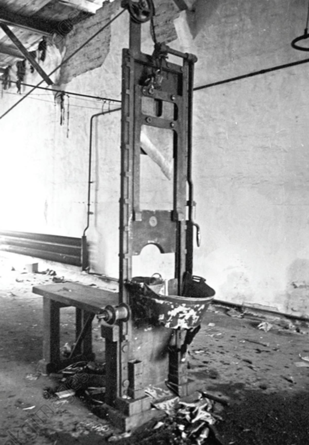 Gilotina centrálního popraviště Třetí říše v trestní věznici Berlín-Plötzensee, duben 1945
