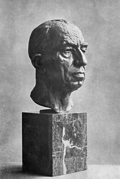 Busta státního prezidenta Emila Háchy zhotovená dle vzoru sochařky Libuše Lepařové. Praha, jaro 1941