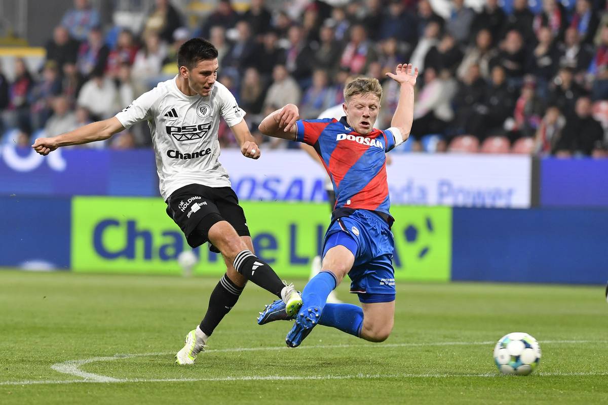 Brankář Mladé Boleslavi Jiří Floder se marně natahuje při pokutovém kopa Jana Chramosty.