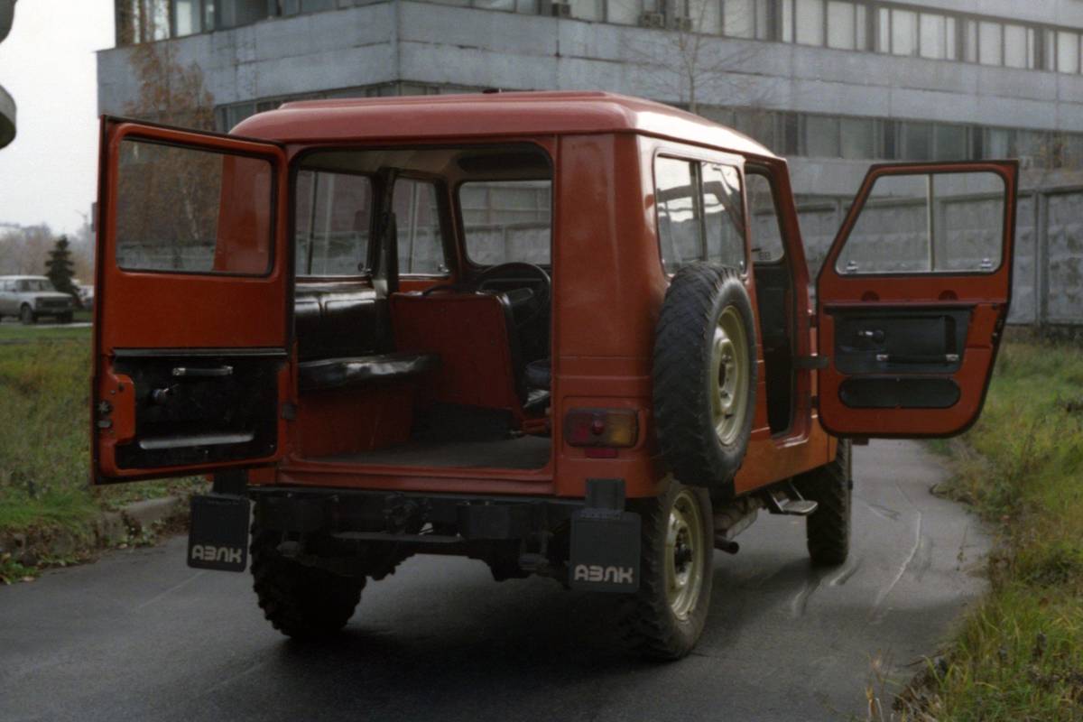 Moskvič 2150 s uzavřenou karoserií, netradičně umístěná rezerva měla zjednodušit konstrukci dveří a zvýšit světlost.