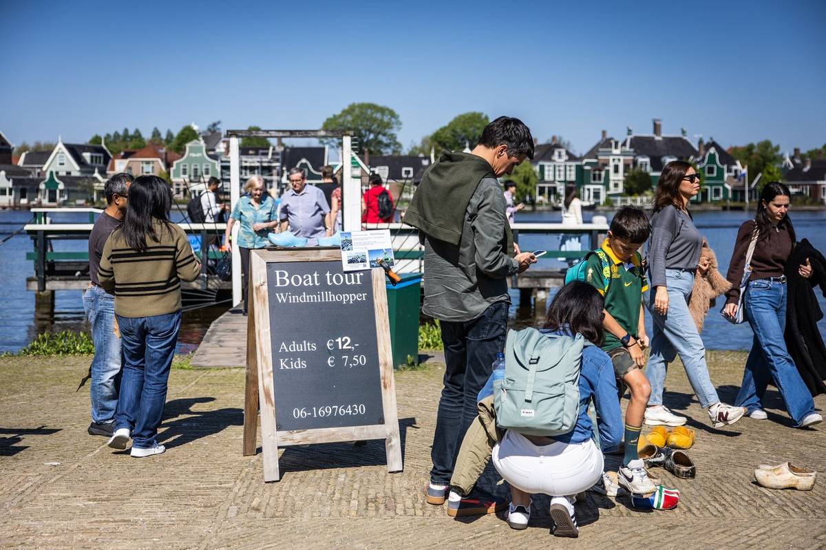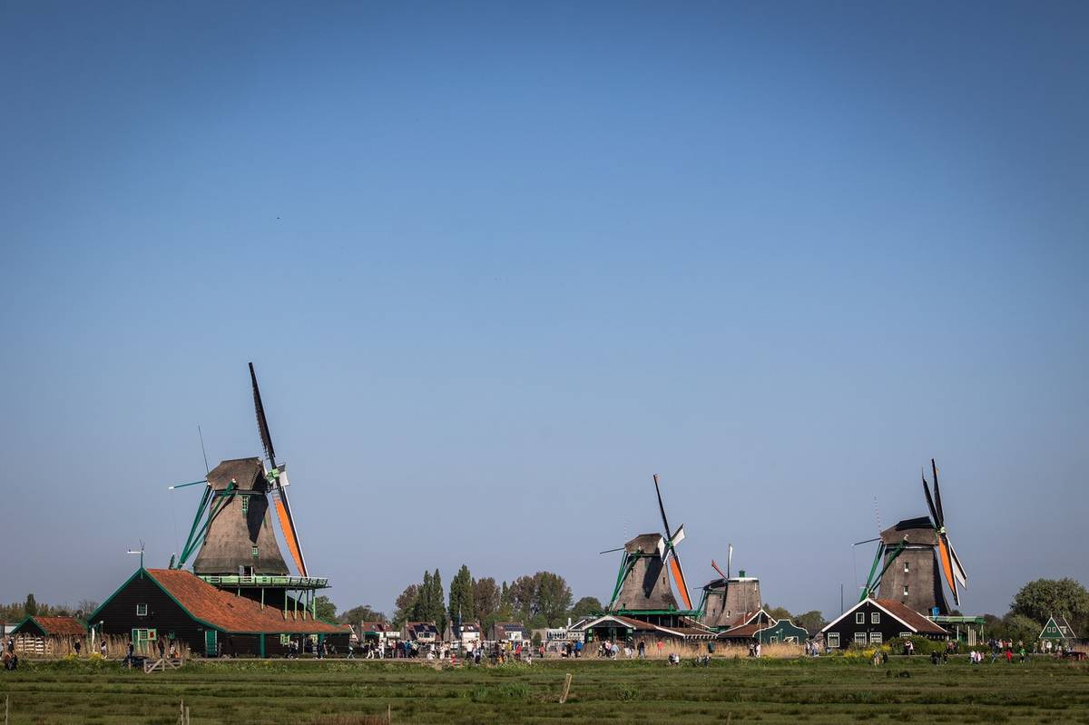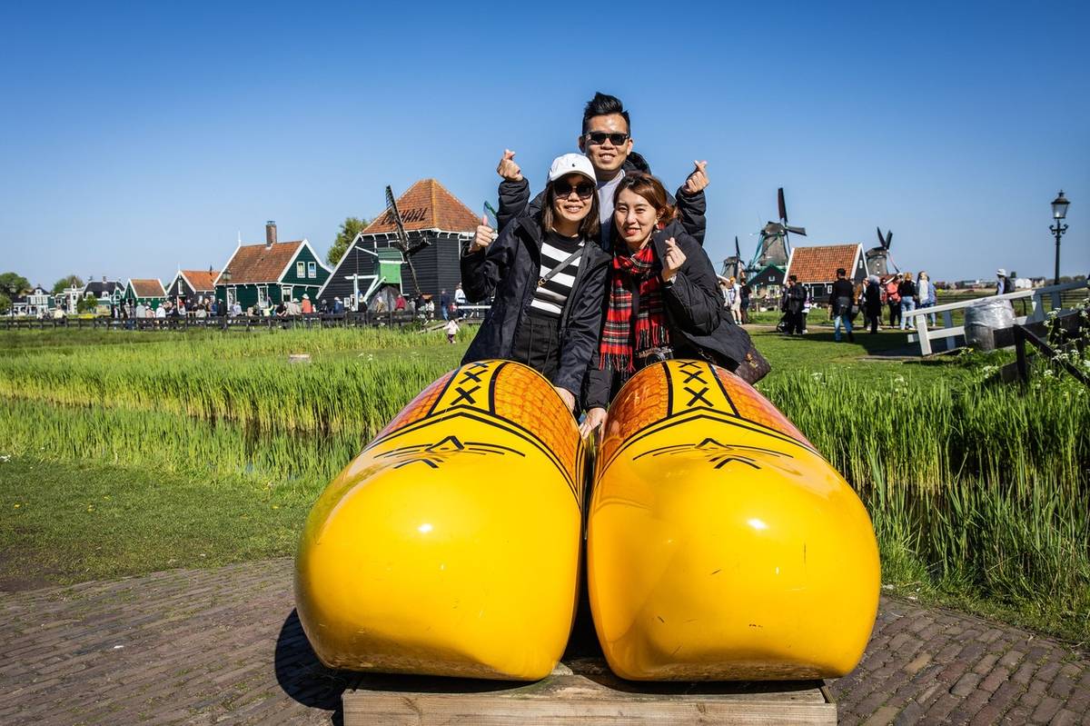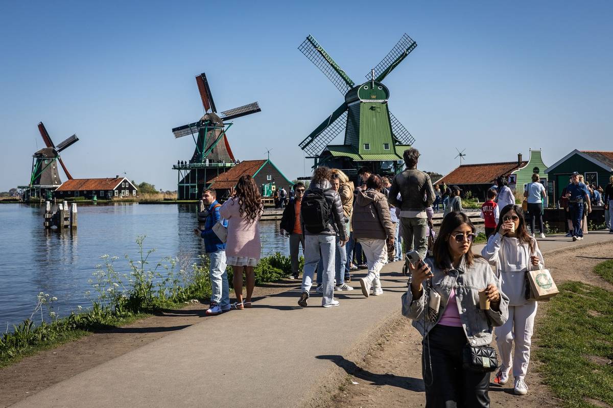 Jde o jedny z nejmalebnějších pohledů Nizozemska, navíc jsou snadno dostupné z Amsterdamu. Vesnice Zaanse Schans a její větrné mlýny letos přilákají odhadem 2,8 milionu návštěvníků. (Turisté se fotí před větrnými mlýny v Zaanse Schans, 31. července 2025.)