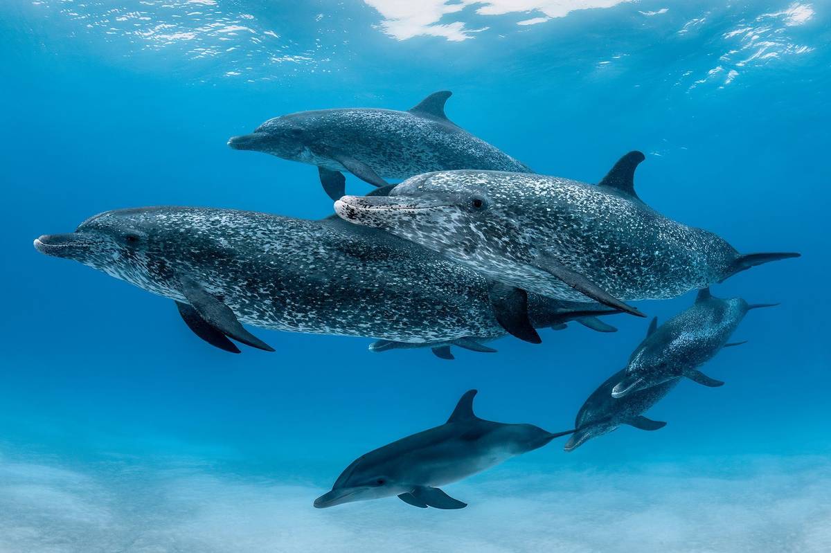 3. místo v kategorii Černobílá fotografie: Serge Melesan (Francie) - Delfíni pod hladinou. (Panasonic Lumix S1, 16-35 mm, ISO 640, f/10, f/320, přirozené světlo, podvodní pouzdro Nauticam SR1).