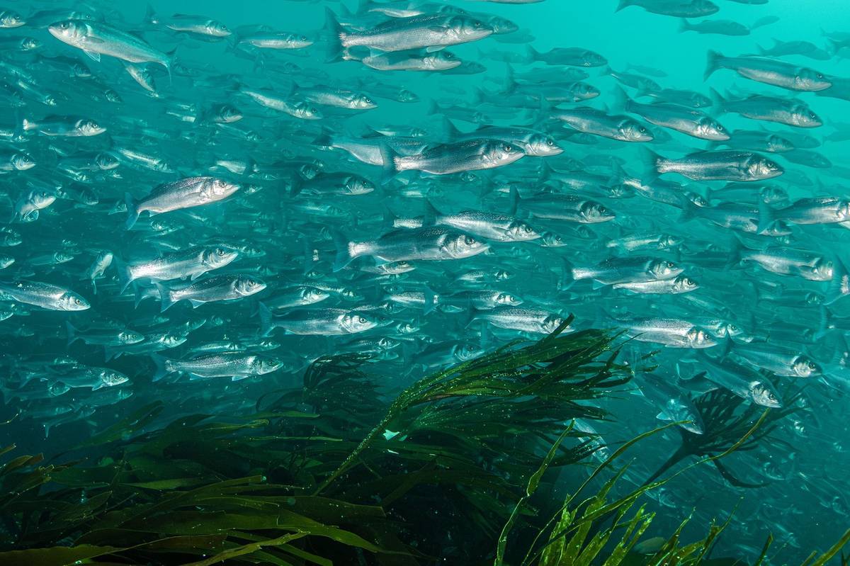 Vítěz v kategorii Mořští živočichové a jejich život: Rafael Fernandez Caballero (Špěnělsko) - Konec hejna sardinek. (Nikon Z9, Nikkor Z 14-30mm, ISO 640, f/10, 1/400 s, přirozené světlo, podvodní pouzdro Isotta Z9).