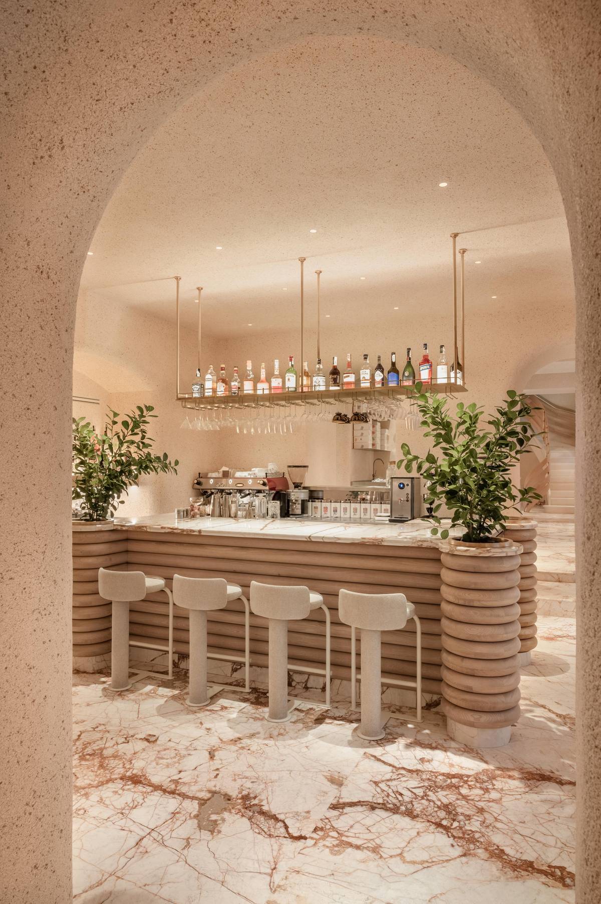 Dřevěné obložení baru připomíná vrstvy polevy na zákuscích a dortech.