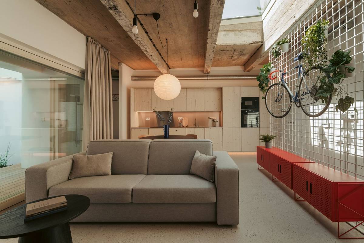 Architekti ponechali v interiéru záměrně některé přiznané prvky, které se tak staly součástí jeho stylu.