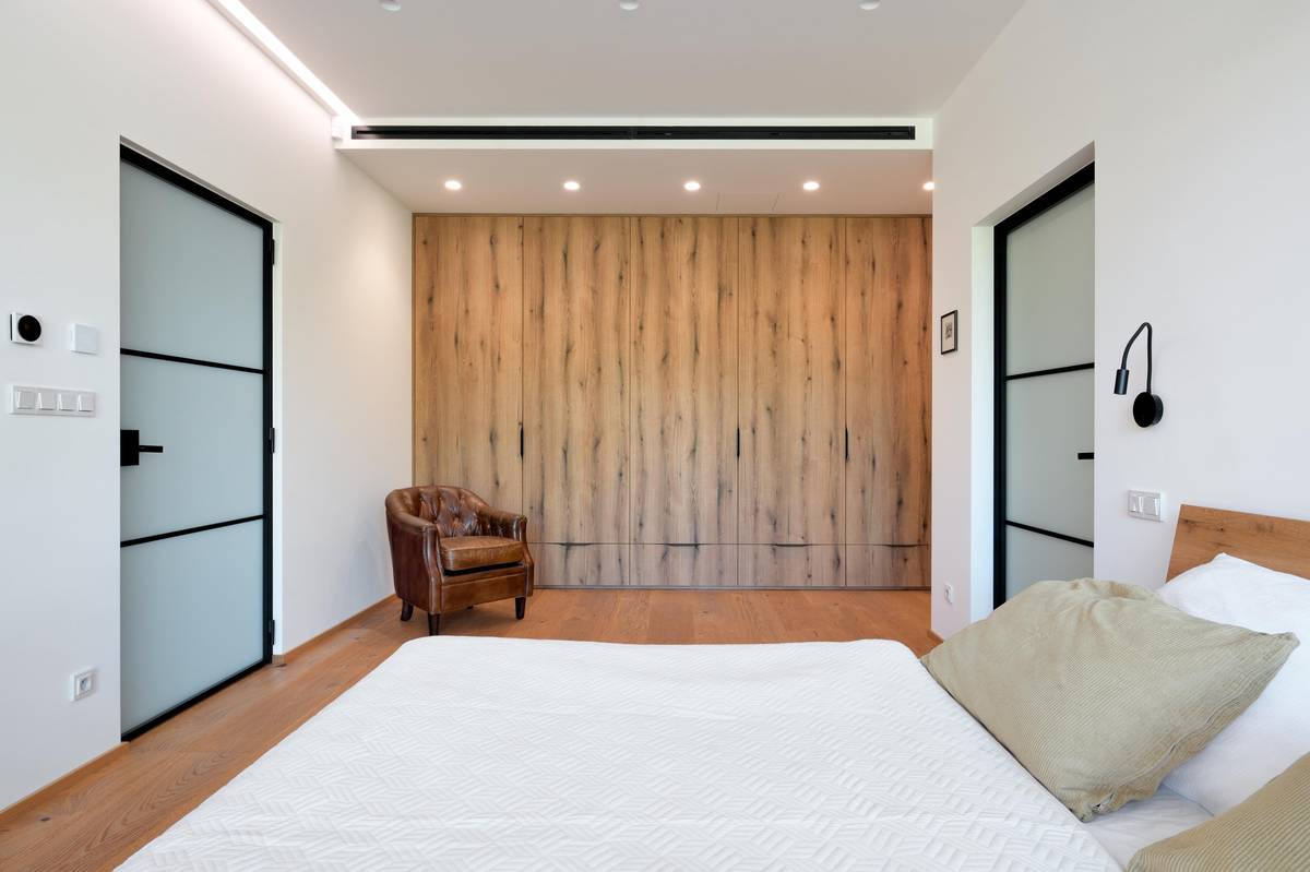 Ložnice rodičů se nachází v jiném patře než zázemí dětí. Zajímavým prvkem je dřevěné obložení stěny.