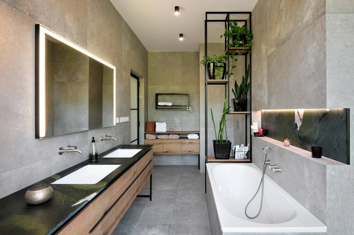 Zajímavým nápadem byla i kombinace obkladů v koupelně s přírodním kamenem.