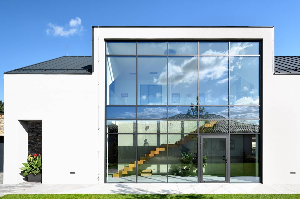 Vizuálně nejvýraznějším prvkem exteriéru domu je velkoformátová fixní okenní stěna s integrovanými prosklenými dveřmi.