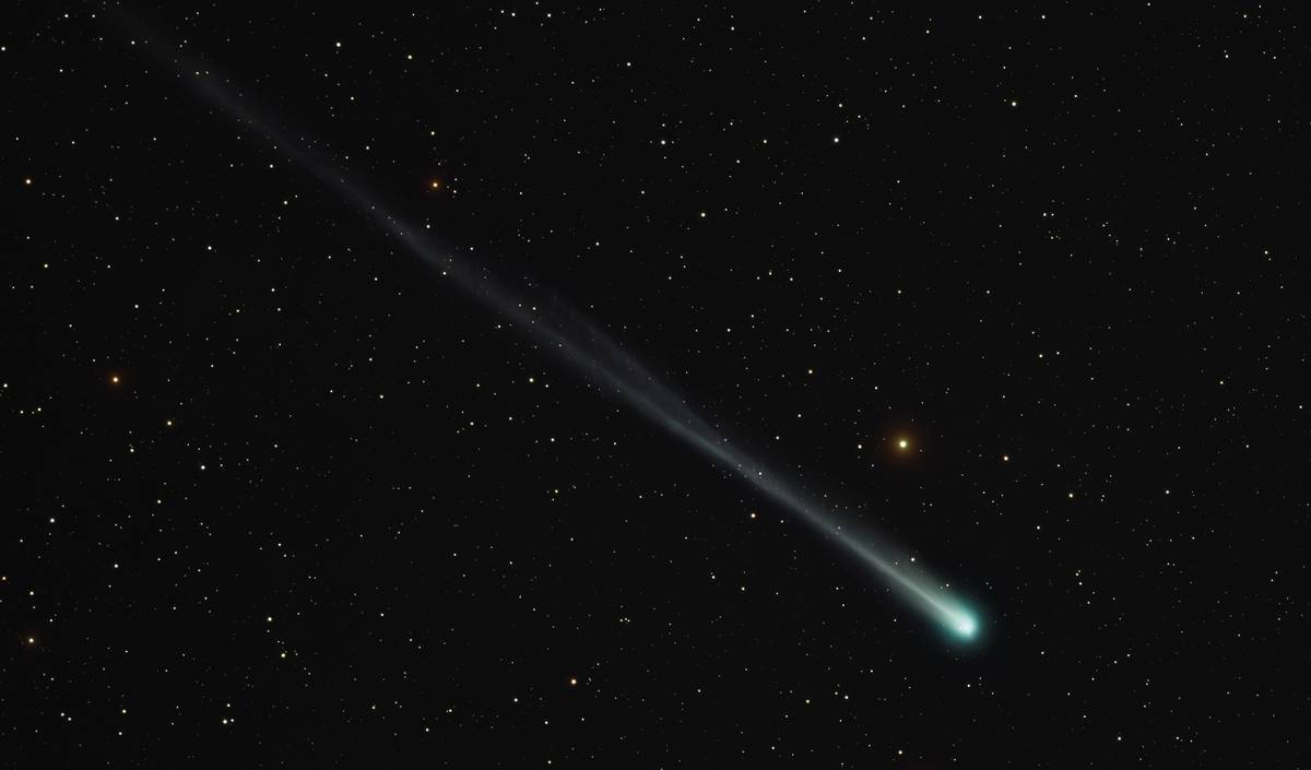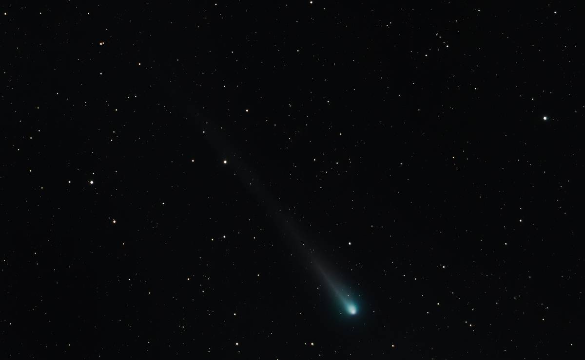 Začátkem října už byla kometa velmi výrazná. Snímek byl zachycen pomocí astromodifikované zrcadlovky a tzv. trackeru, tedy přístroje pro sledování noční oblohy. Následně byly poskládány jednotlivé subexpozice, které dohromady daly asi jednu hodinu snímání (4. 10. 2025).