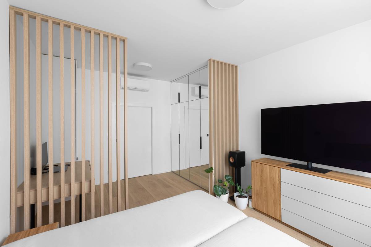 Polopropustná příčka z latí plní funkci dělicího prvku, aniž by bránila volnému plynutí světla místností.
