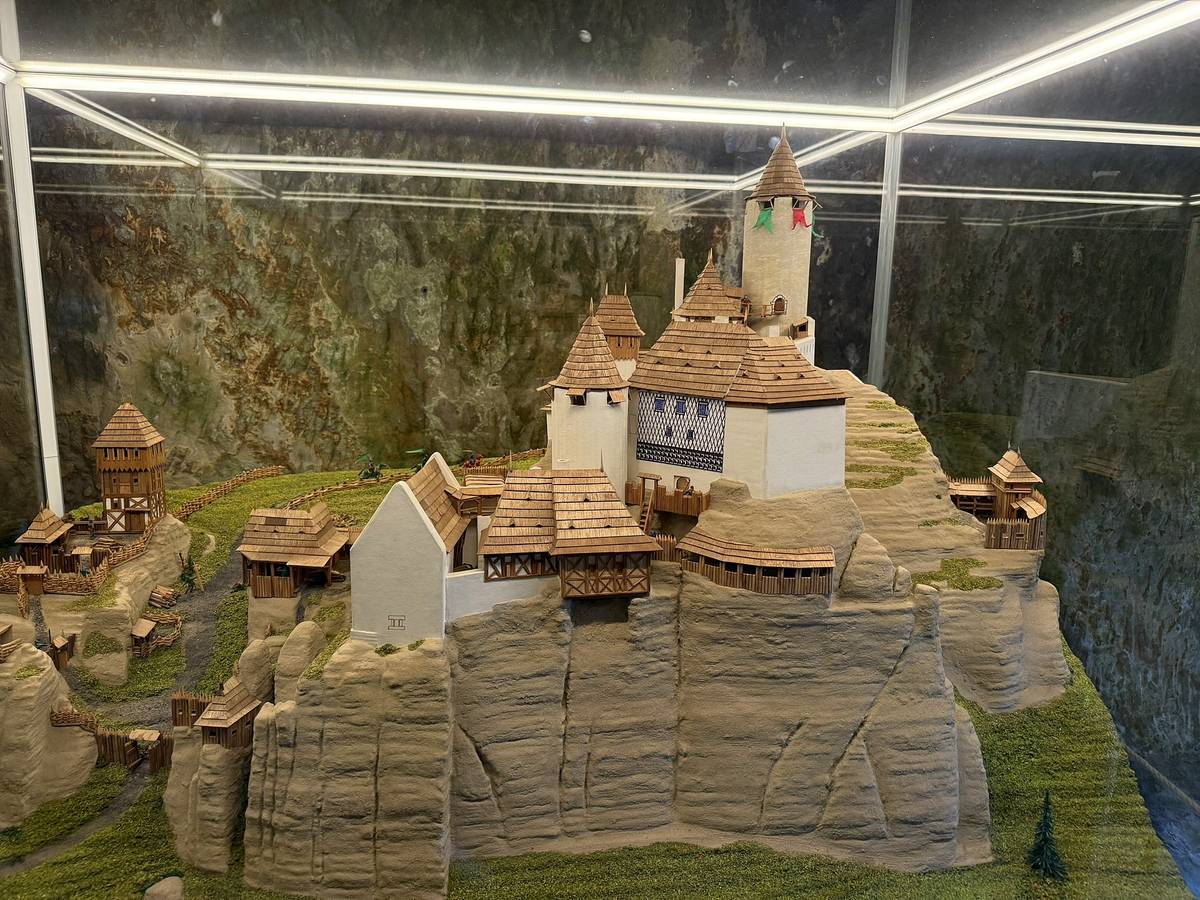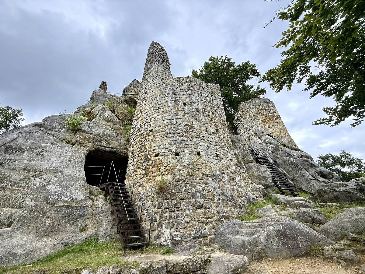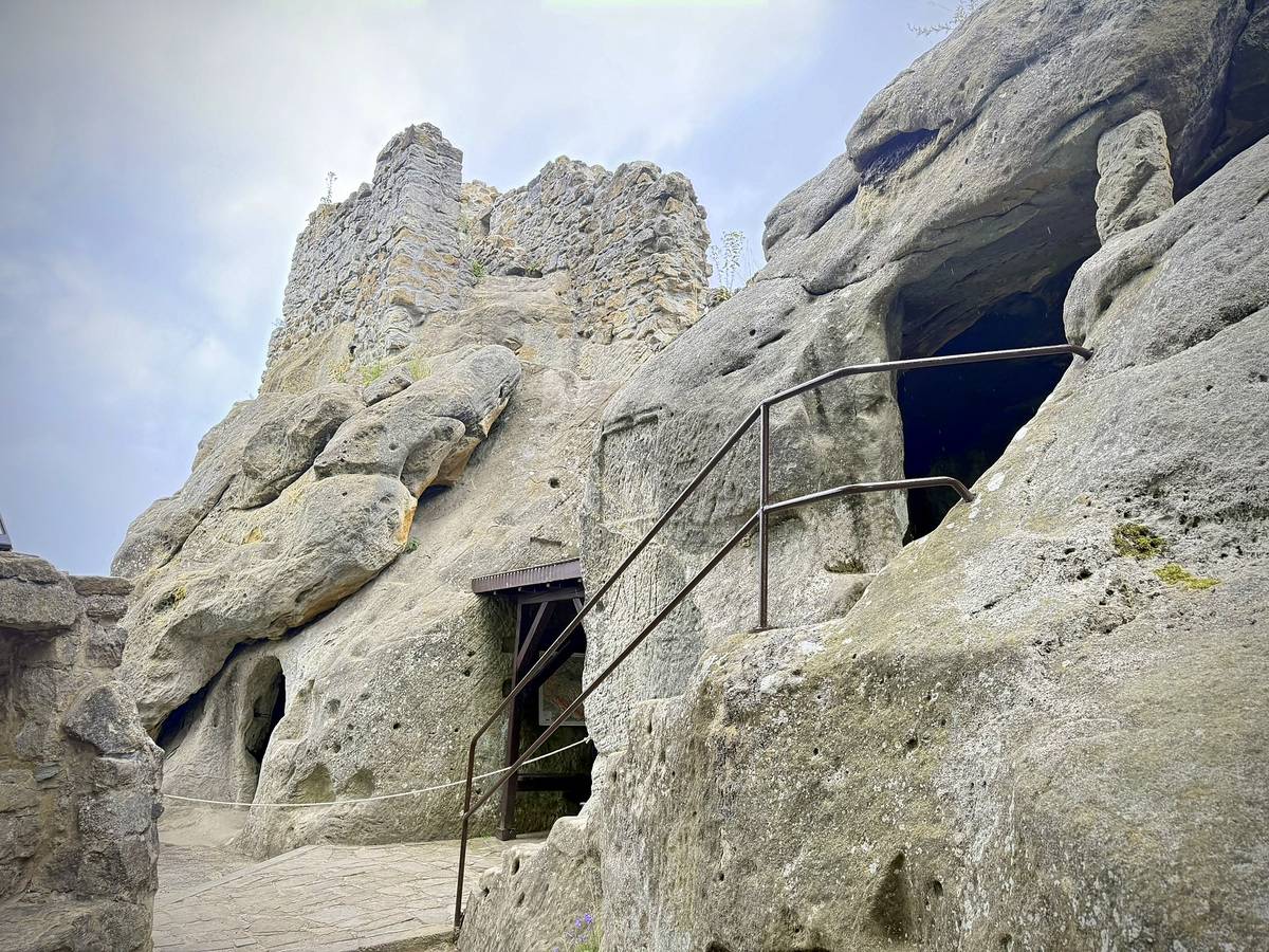 Místnosti vytesané ve skále a věž jsou hlavními zachovalými částmi hradu.