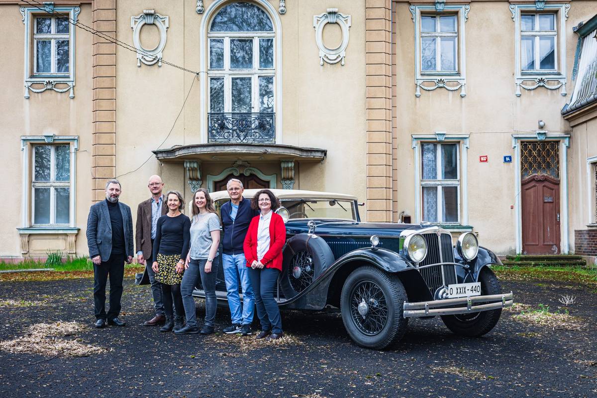 Pravnoučata Heinricha Schichta s Pavlem Kasíkem (a jeho manželkou Martinou, po stranách), který zrekonstruoval automobil Tatra 80, jehož prvním majitelem byl Heinrich Schicht.