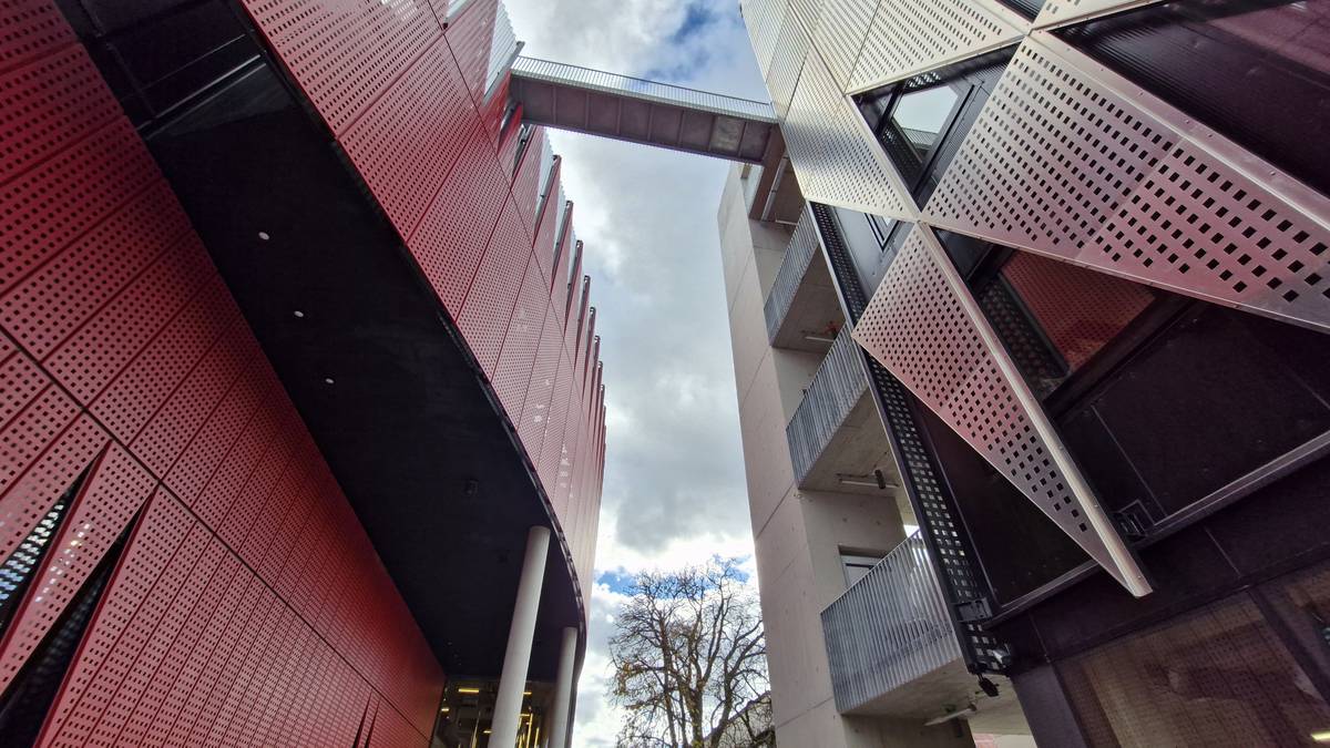 Součástí projektu Horácké arény je i sousední nárožní objekt se stříbrnou fasádou, přístup na atletický ovál na střeše zajišťuje lávka.