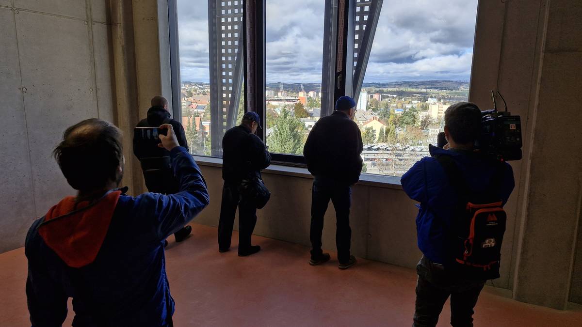 Jeden z hlavních tvůrců arény, architekt Ondřej Chybík (vlevo), při prohlídce dokončené stavby. Arény s nárožním objektem propojuje lávka.