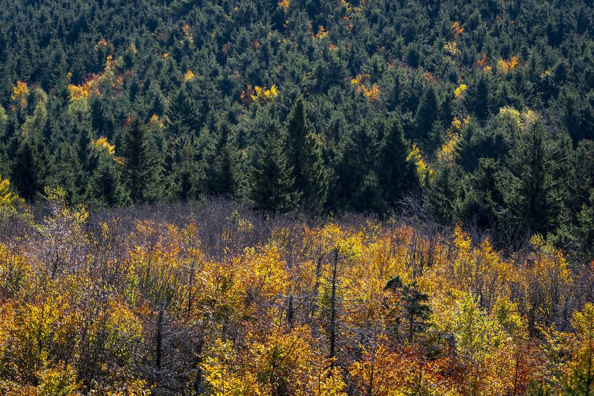 Skály na ještědském hřebenu vykukují nad zbarvené stromy osvětlené vycházejícím sluncem.