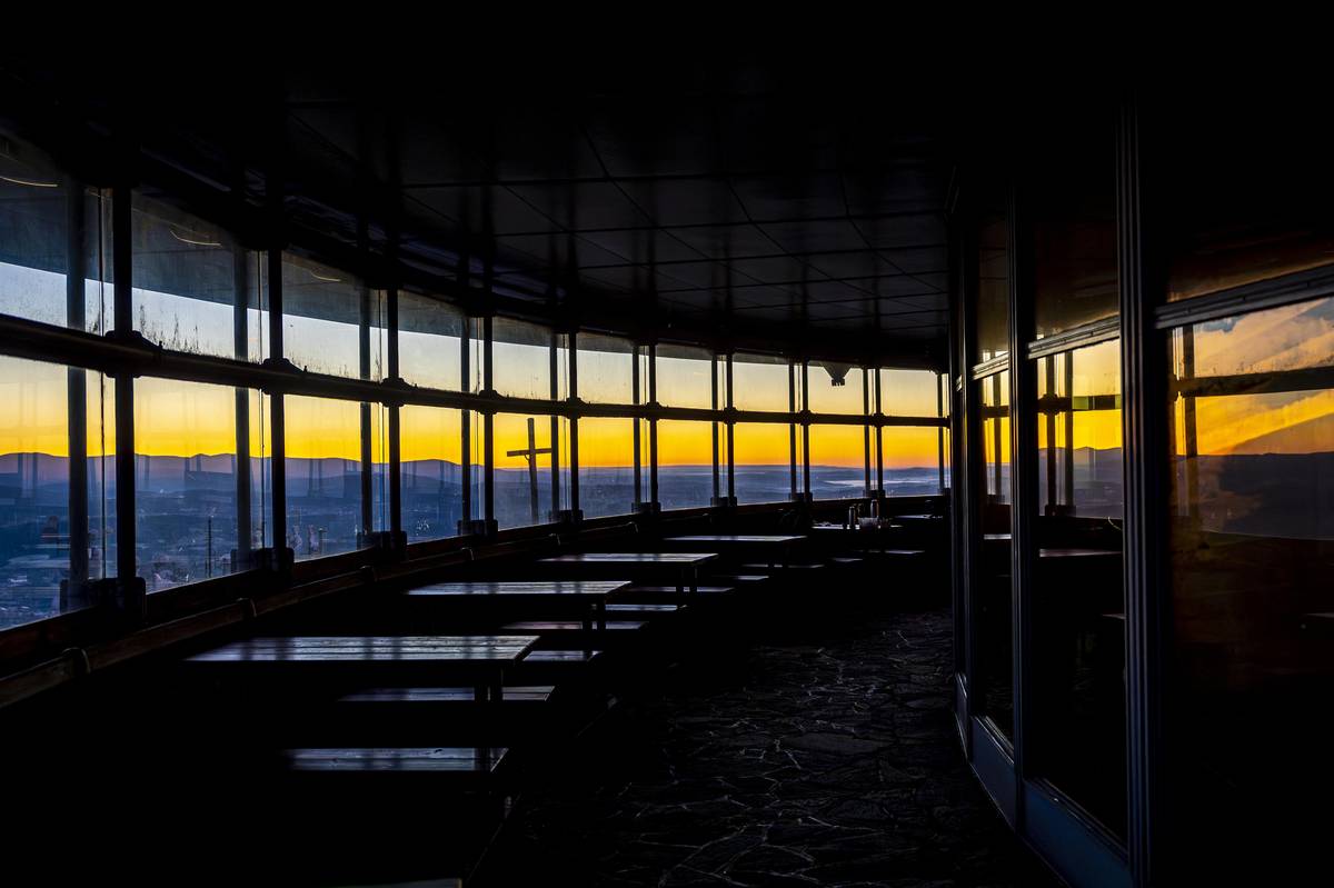 Prázdný ochoz na ještědském vysílači v barvách vycházejícího slunce