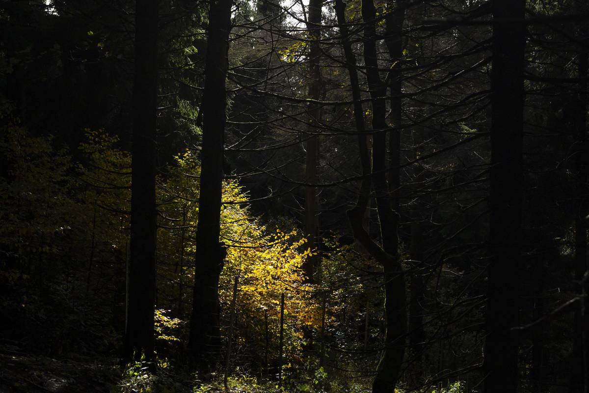 V podzimním slunci vystupují ze tmy zlatavě zabarvené stromy.