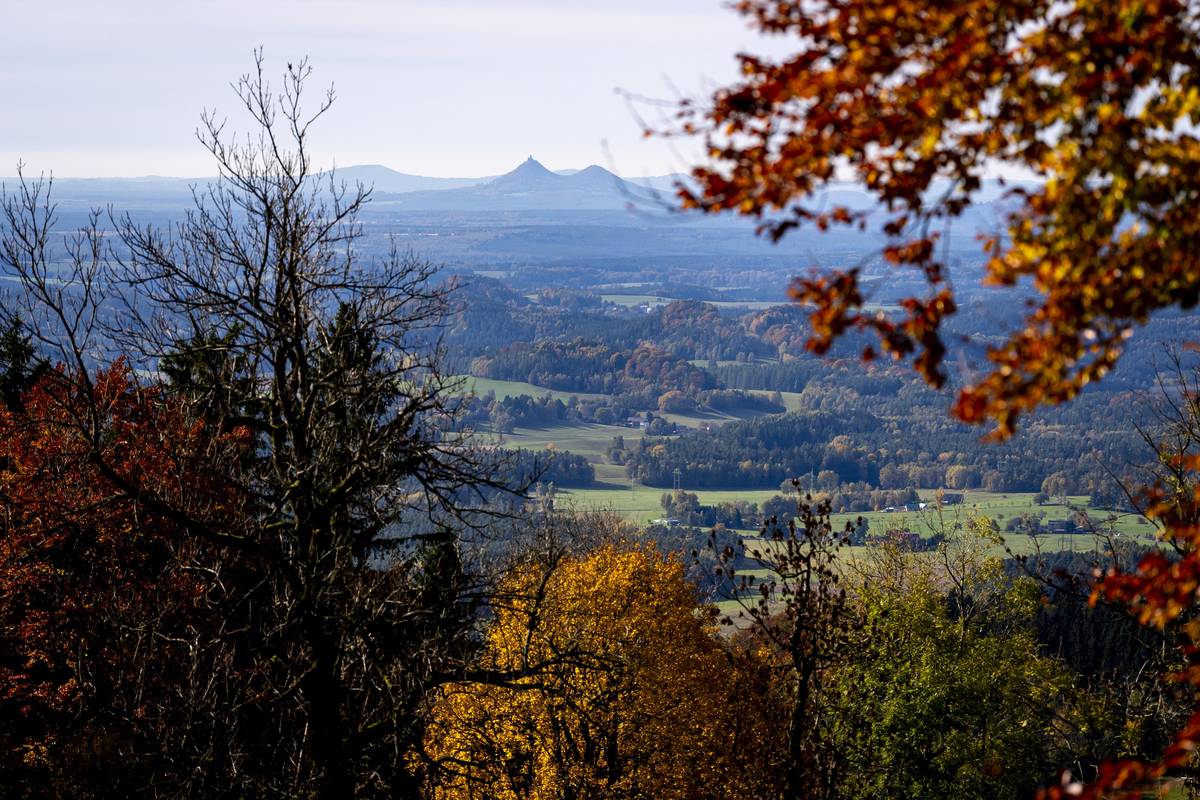 V údolí podzim přebírá vládu pomaleji, na kopci už je v plné síle. Na horizontu kopce Bezdězu.