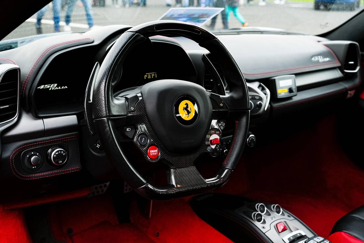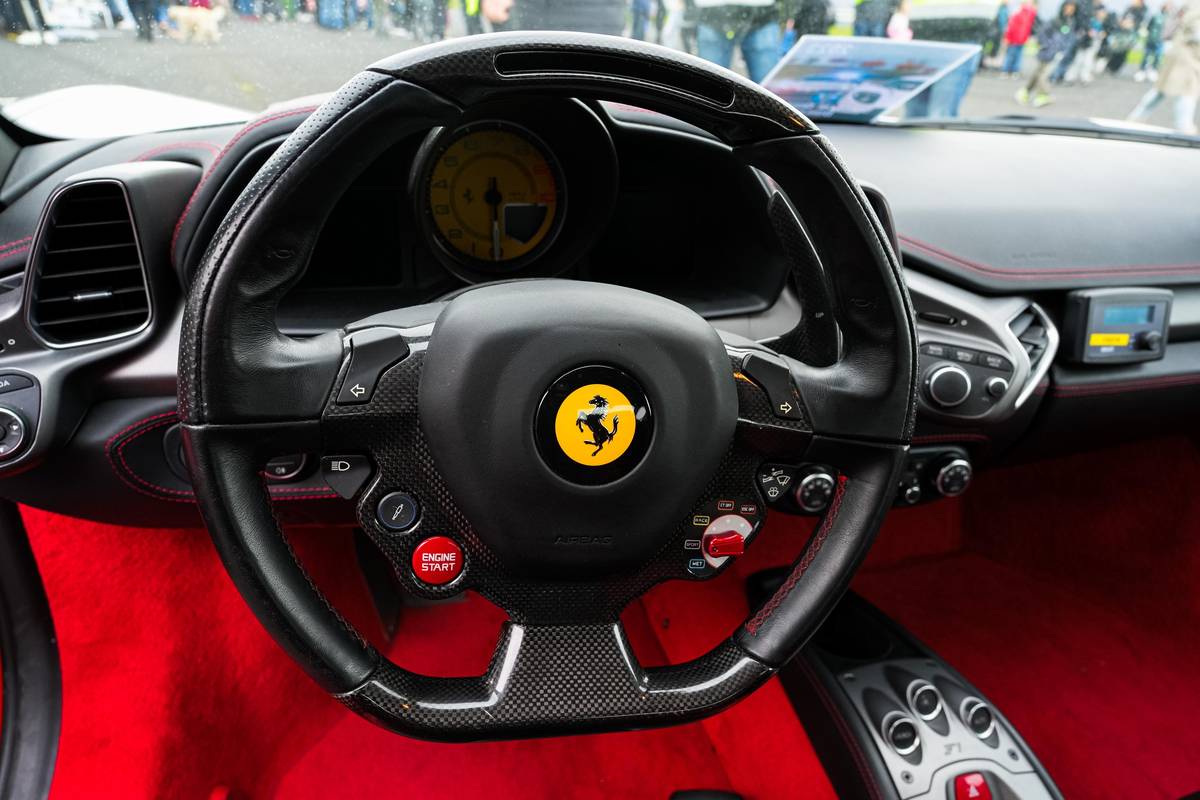 Detailní pohled na volant. Vozidlo má 7stupňovou automatickou převodovku a výkon 416 kW.