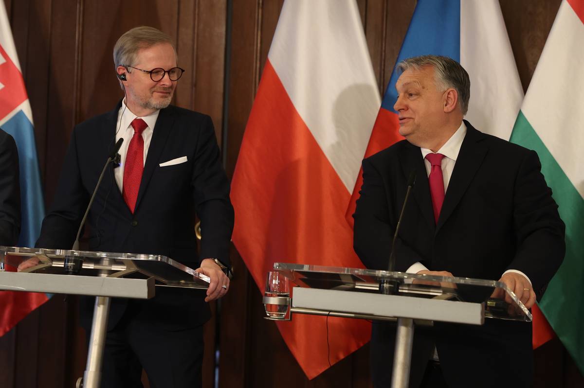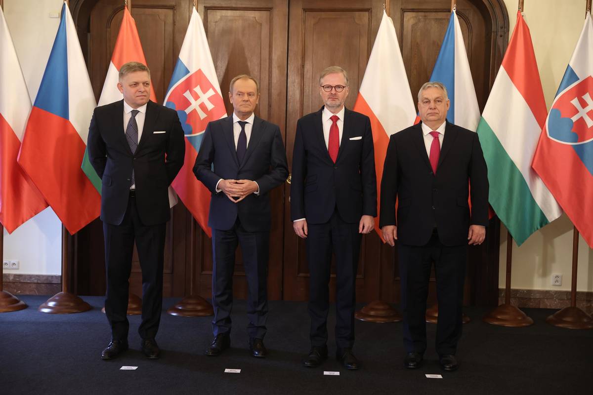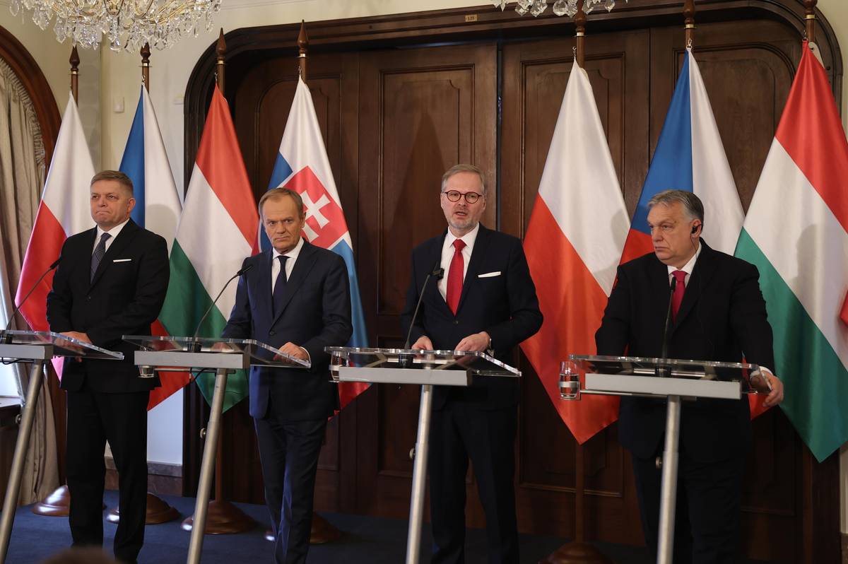 Tusk a Fiala se sešli už před summitem V4 v Úřadu vlády. Oba slíbili, že dají Ficovi a Orbánovi své výhrady vůči jejich politice jasně najevo. Na snímku zleva: Fico, Tusk, Fiala a Orbán.