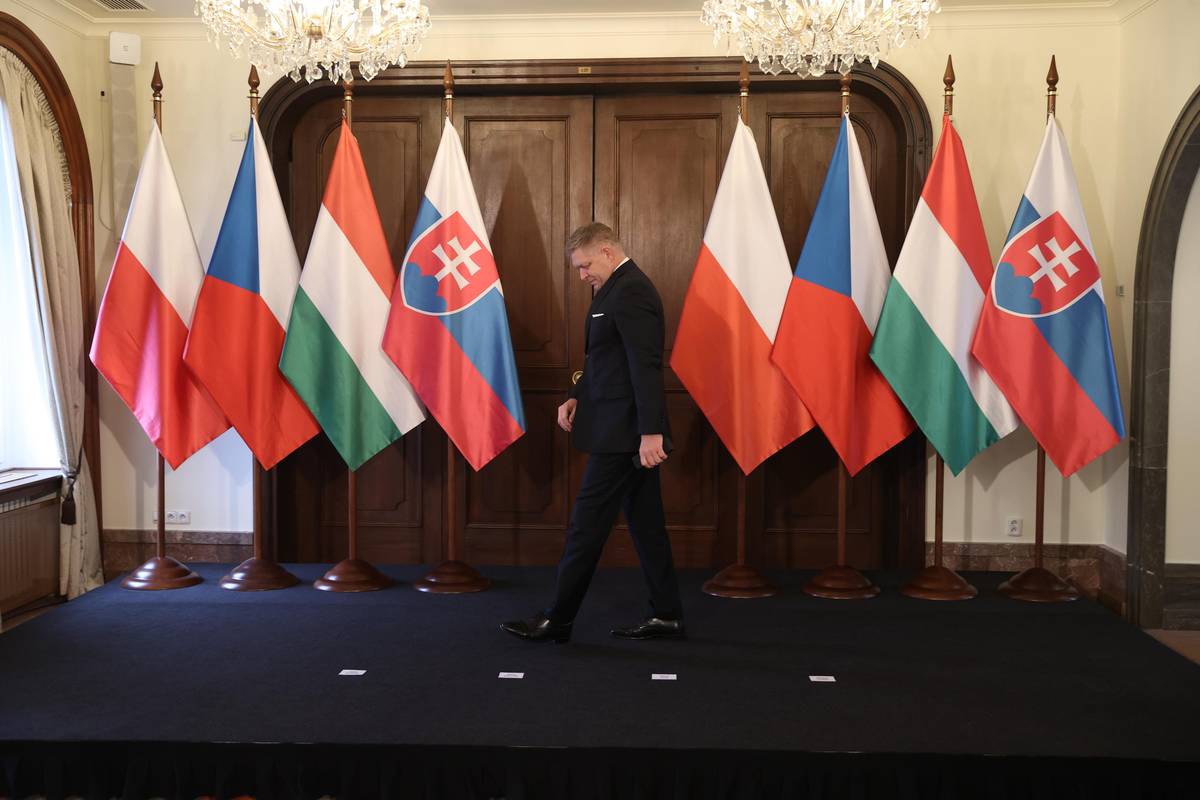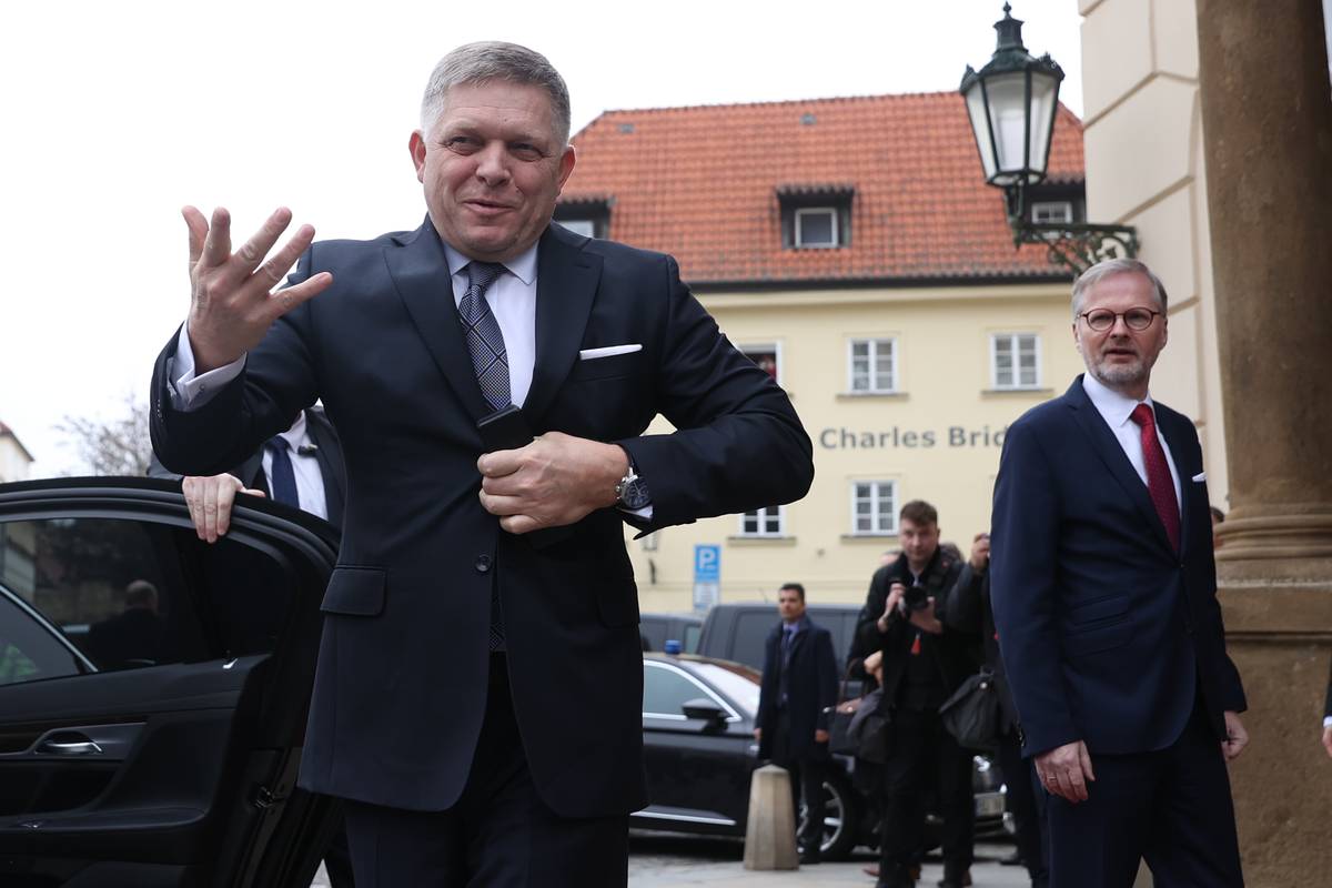 Hlavním bodem programu ale byl summit lídrů Visegradské skupiny. Čtveřice premiérů se v Praze sešla v situaci, kdy je jasně patrné, že blok se „rozpadl“ na dvě skupiny po dvou. Rozdíly pramení zejména z přístupu státníků k ruské válce na Ukrajině. Na snímku Robert Fico při příjezdu na jednání v malostranském Lichtenštejnském paláci, v pozadí stojí předseda české vlády Petr Fiala z ODS.