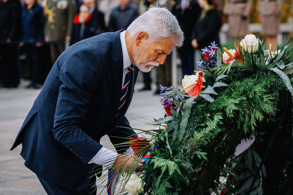Prezident Petr Pavel a čestná jednotka armády u památníku na Vítkově.