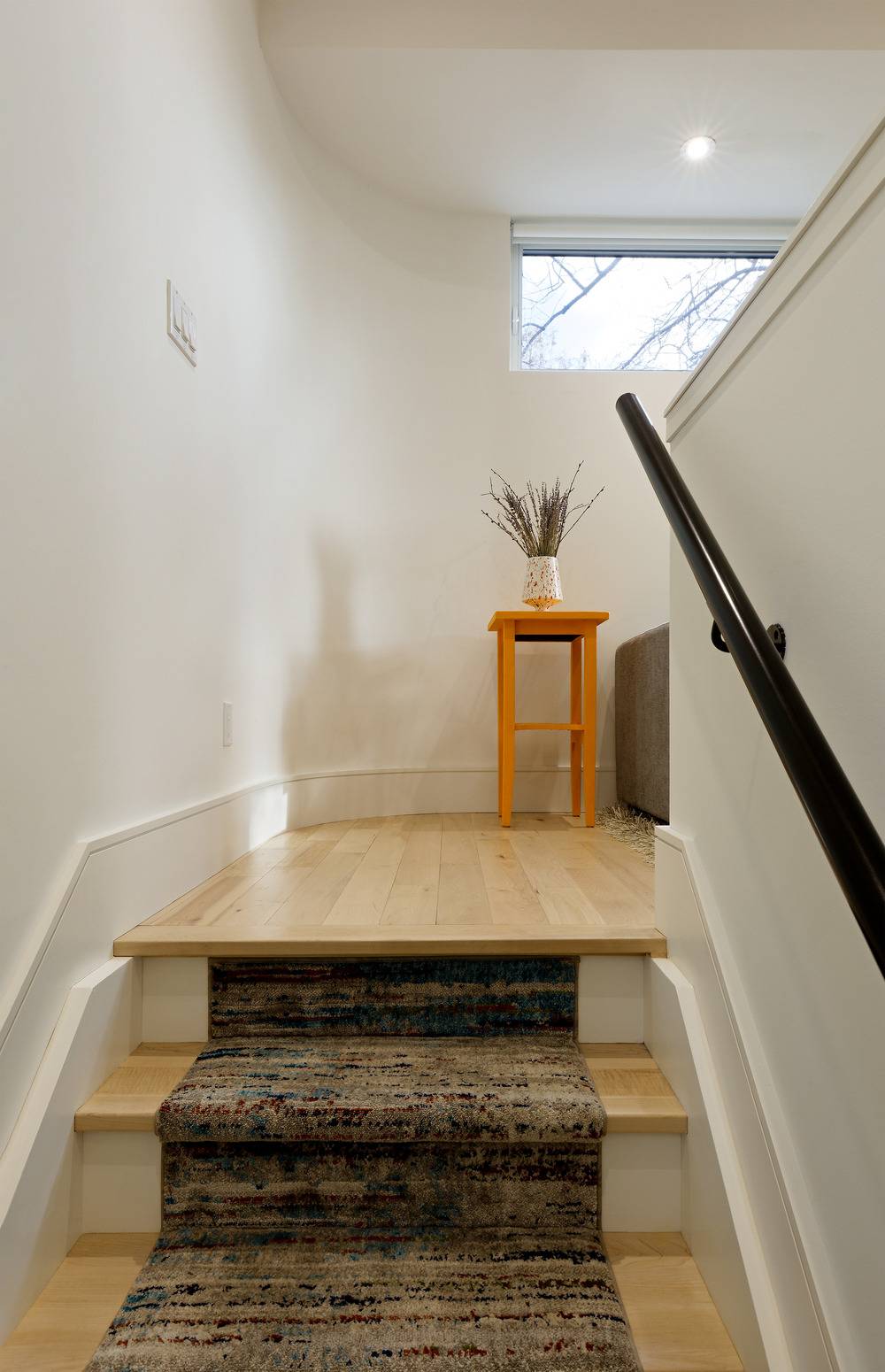 Koberec na schodech se už jen tak nevidí. Zde ale plní svou základní funkci. Tlumí hluk kročejů.