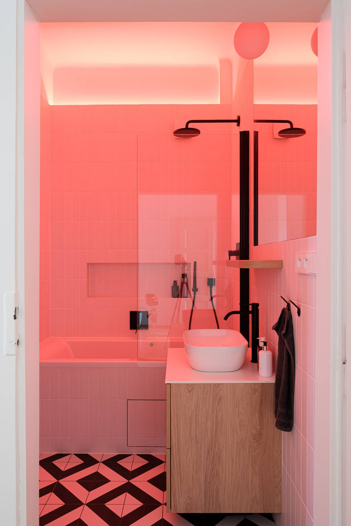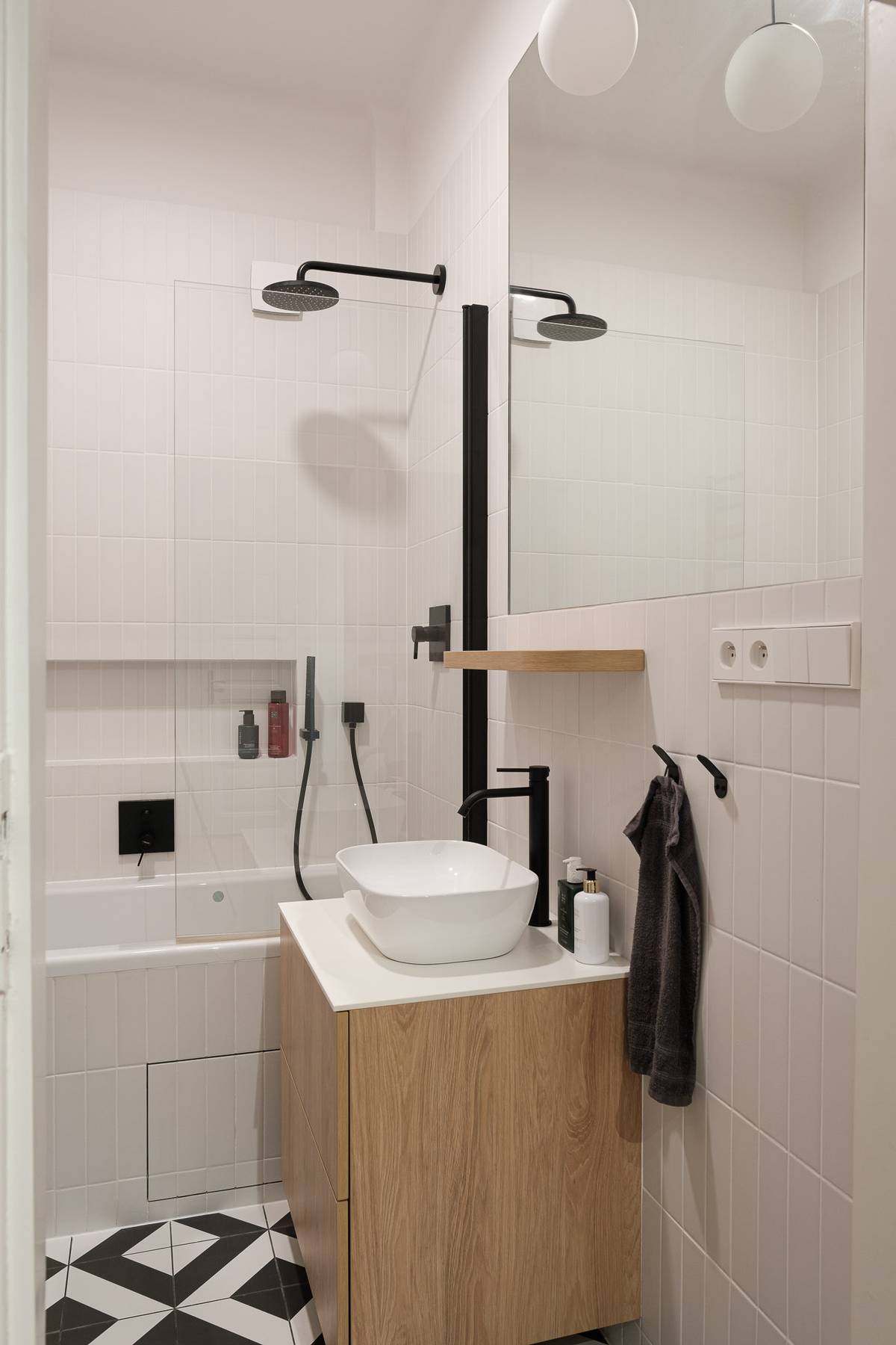 V omezeném prostoru koupelny zvolili architekti kompromisní řešení mezi vanou a sprchovým koutem.