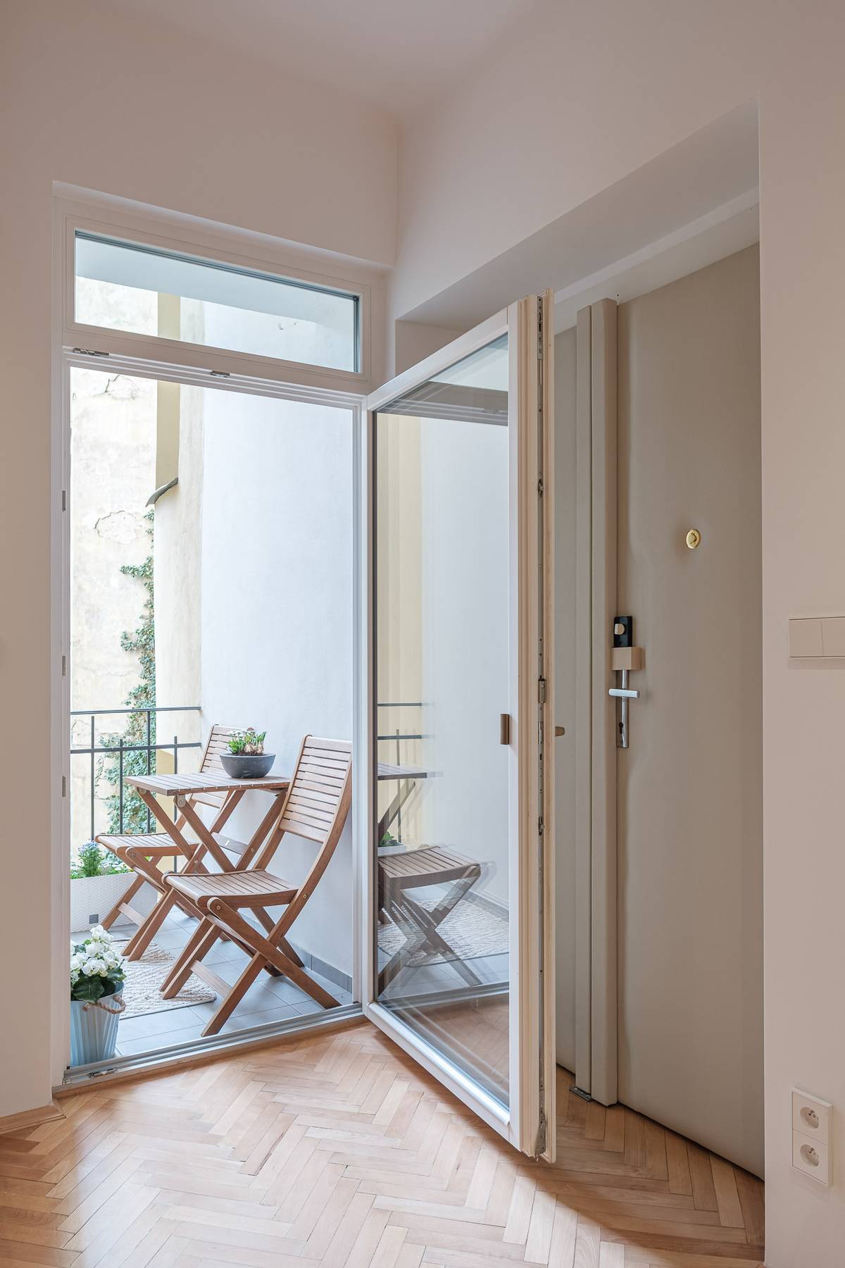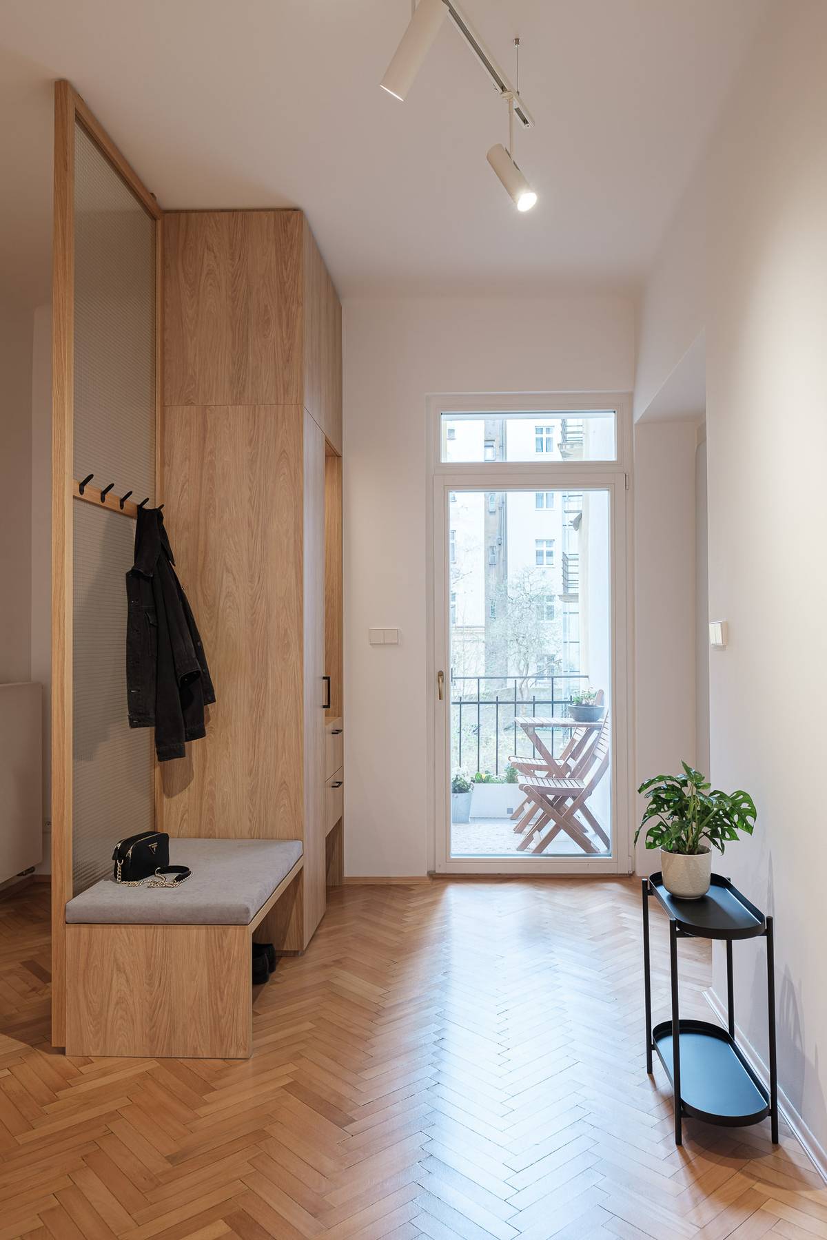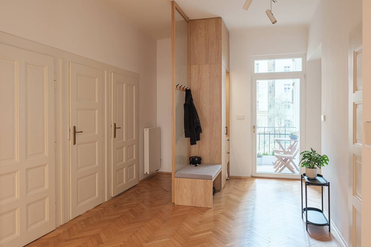 Interiér předsíně je osvětlen díky proskleným dveřím na balkon.
