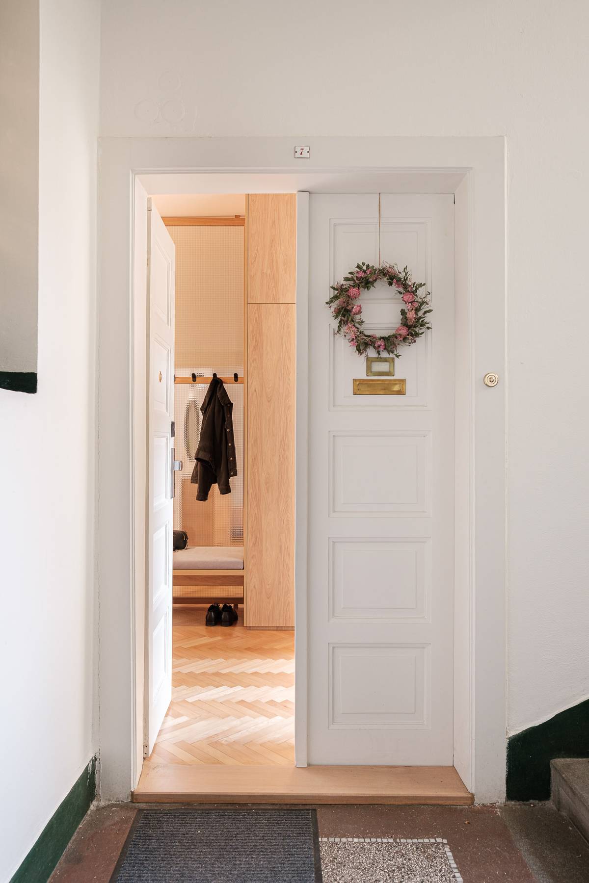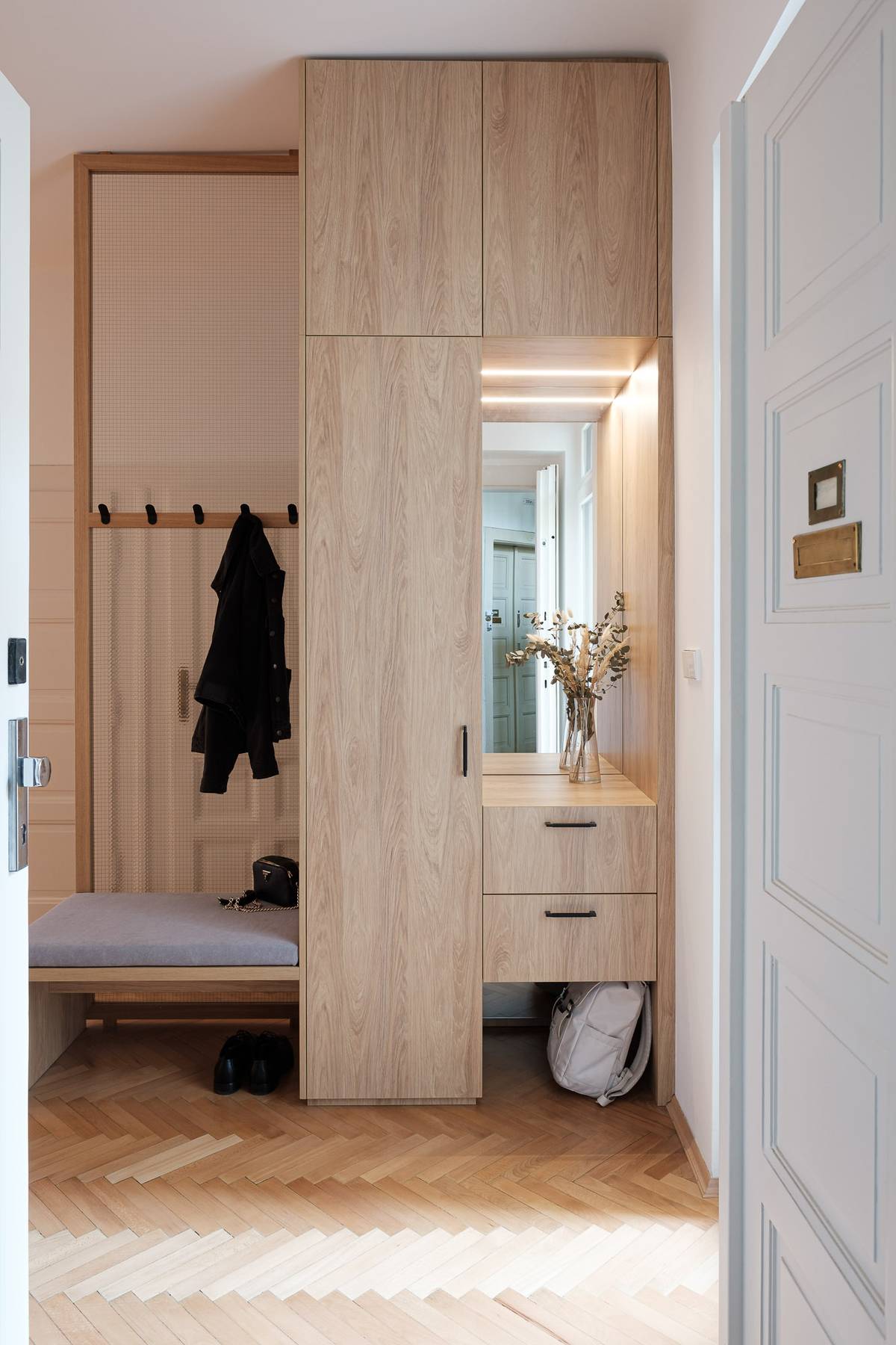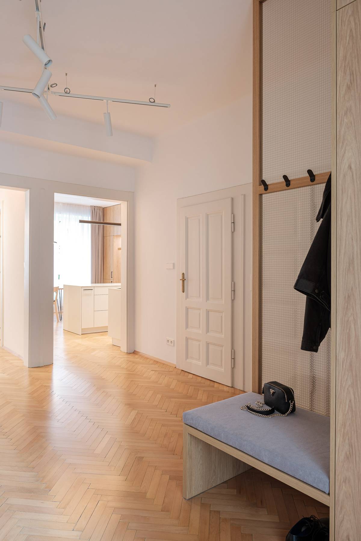 Interiér předsíně je osvětlen díky proskleným dveřím na balkon.
