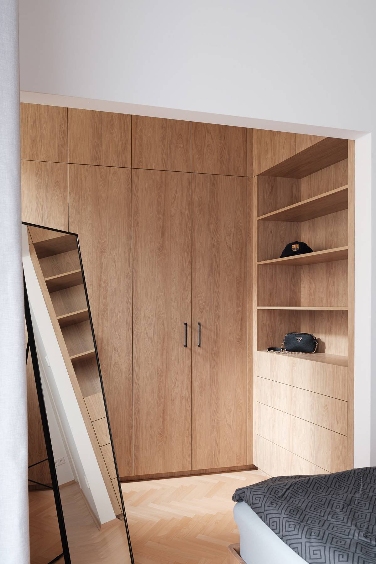 Skříň sahající až ke stropu umožňuje ukládání sezónního oblečení.