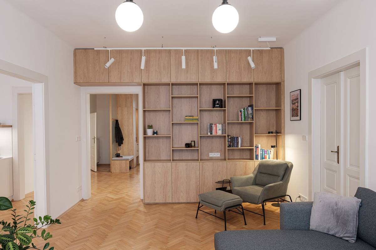 Knihovna má hravé uspořádání polic. Praktickým prvkem je křeslo umístěné v jejím těsném sousedství. Člověk to z něj pro knihu nemá daleko.