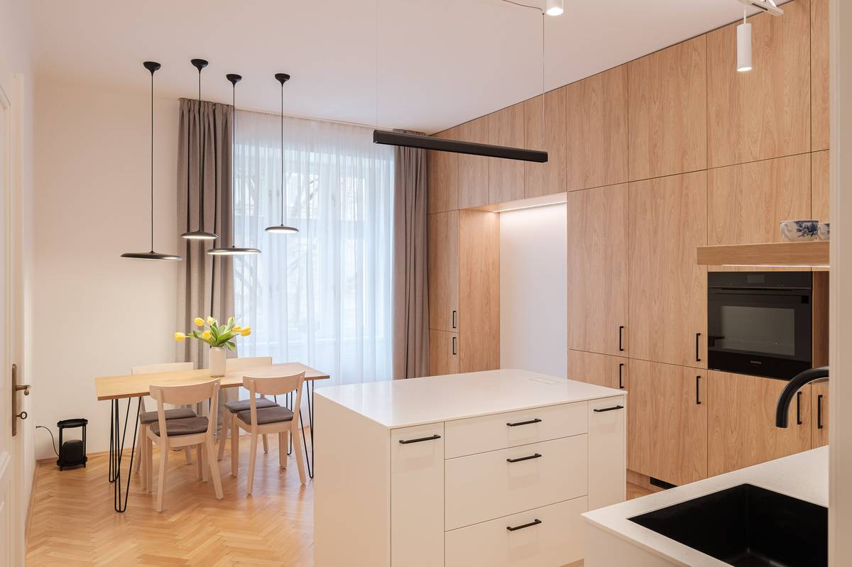Kuchyňský ostrůvek slouží zároveň jako snídaňový bar.