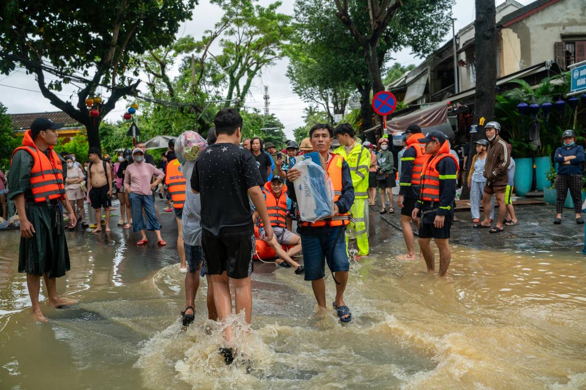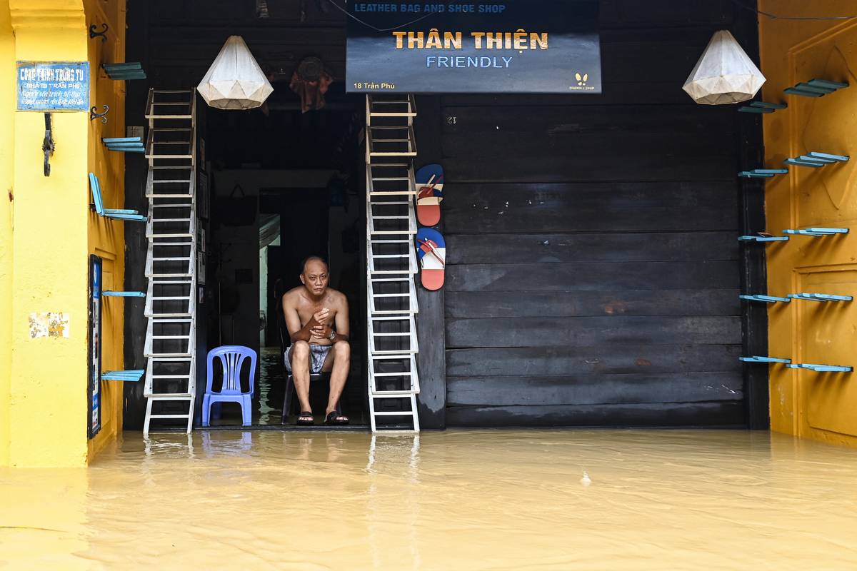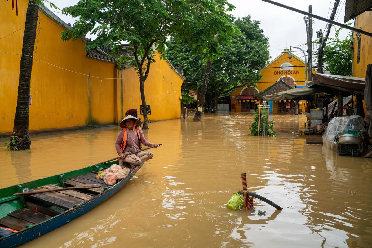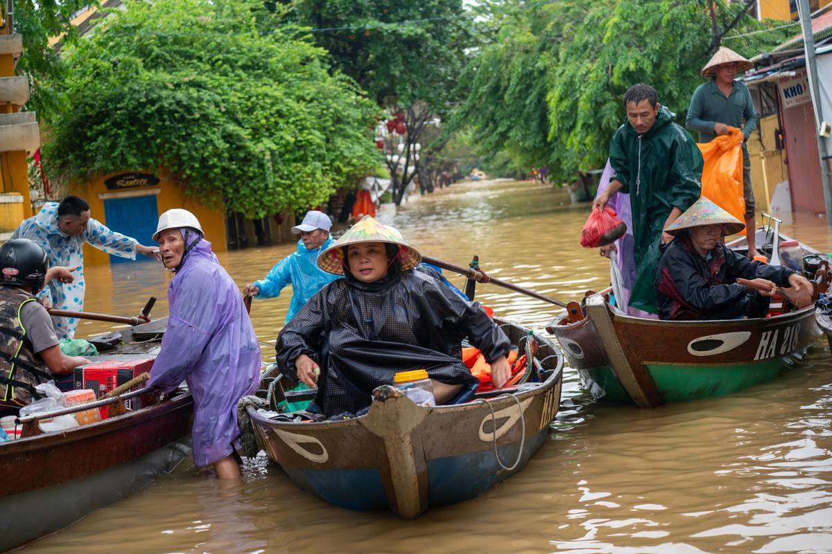 „Lidé ve čtvrtek řídili čluny a brodili se po pás ve vodě ulicemi Hoi An, kde byly zaplaveny přízemní části domů a obchodů,“ uvedl reportér AFP. (30. října)
