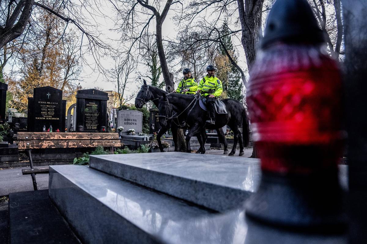 Na pořádek dohlíží strážníci na koních.