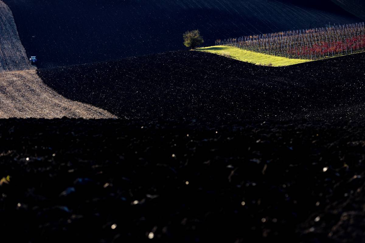 Čerstvě zoraná zemina se na slunci leskne.